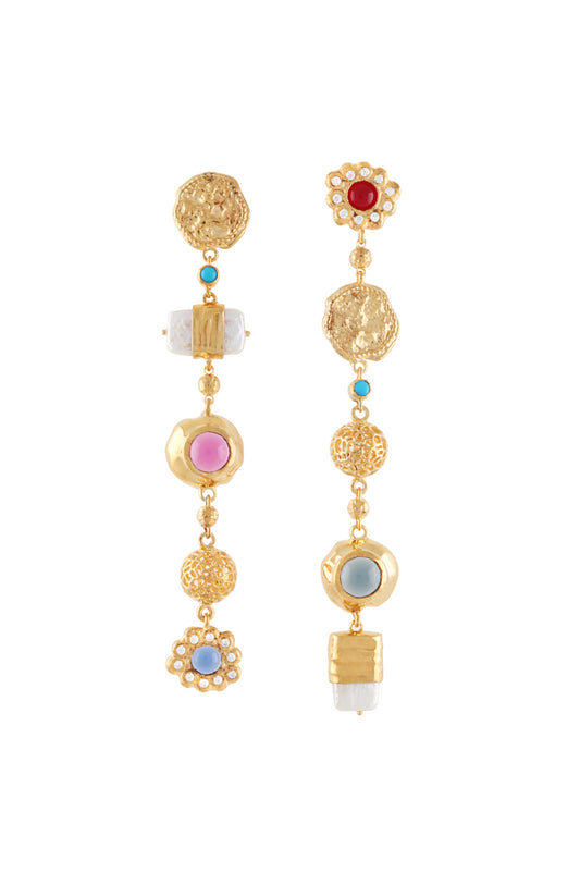 Long Mismatched Earrings With Pearl & Cabochon
