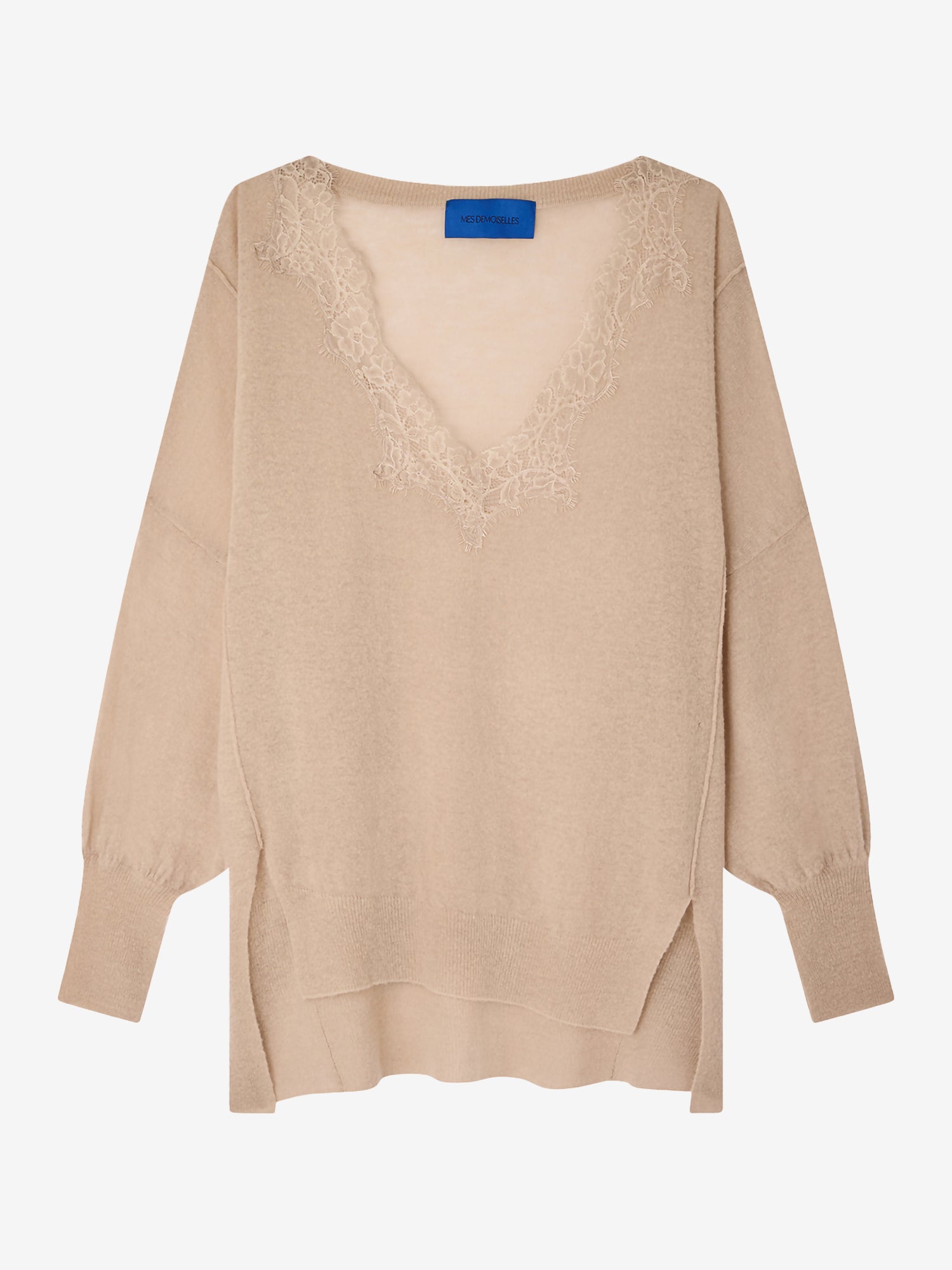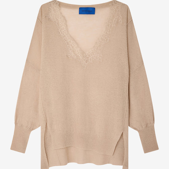 Effortlessly elegant with a touch of femininity, the Aera Blouse Beige from Mes Demoiselles is a timeless wardrobe essential. Crafted in a beautifully soft, lightweight knit, this relaxed-fit jumper features a flattering V-neckline finished with delicate lace detailing for a subtle, romantic edge.