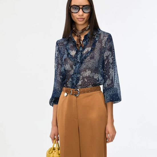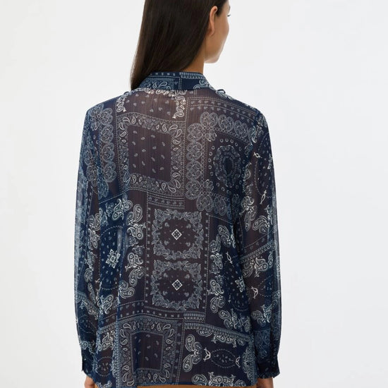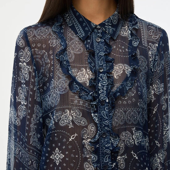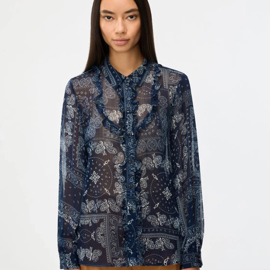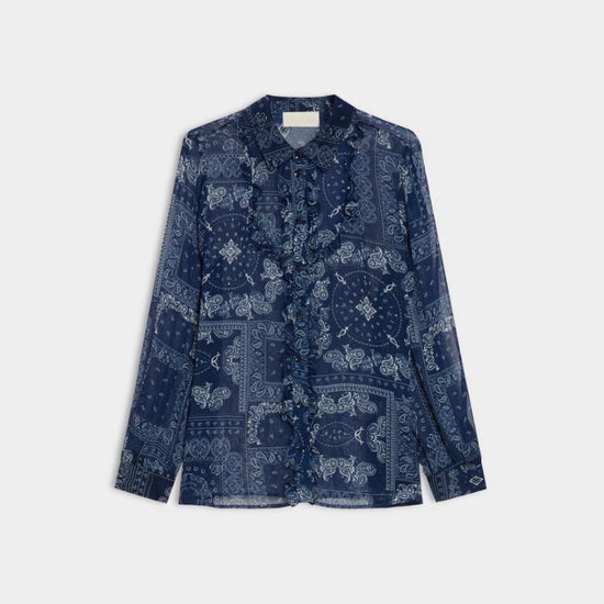 The Alarico Shirt Cornflower from iBlues is a refined statement piece designed to bring colour and character to everyday dressing. Made from printed crepe with a figure-skimming, regular cut, it features a rich navy blue background adorned with a delicate paisley print for a timeless yet expressive look. Ruffle detailing along the placket and a softly ruched front add feminine texture, while the classic collar, long cuffed sleeves, and button fastening keep the silhouette polished.
