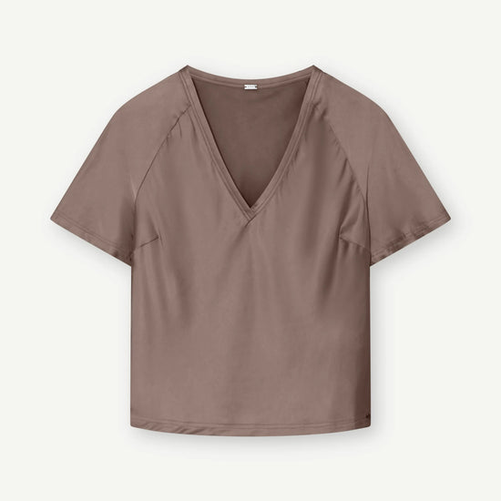 The rich leafless hue - a warm taupe‑brown tone - offers a chic, earthy neutral that complements everything from light denim to rich autumnal shades. Designed with a flattering V‑neckline and short sleeves, its clean, effortless silhouette makes it perfect for layering under blazers, cardigans, or heavy knits. When the sun comes out, it stands beautifully on its own - stylish, silky, and refined.