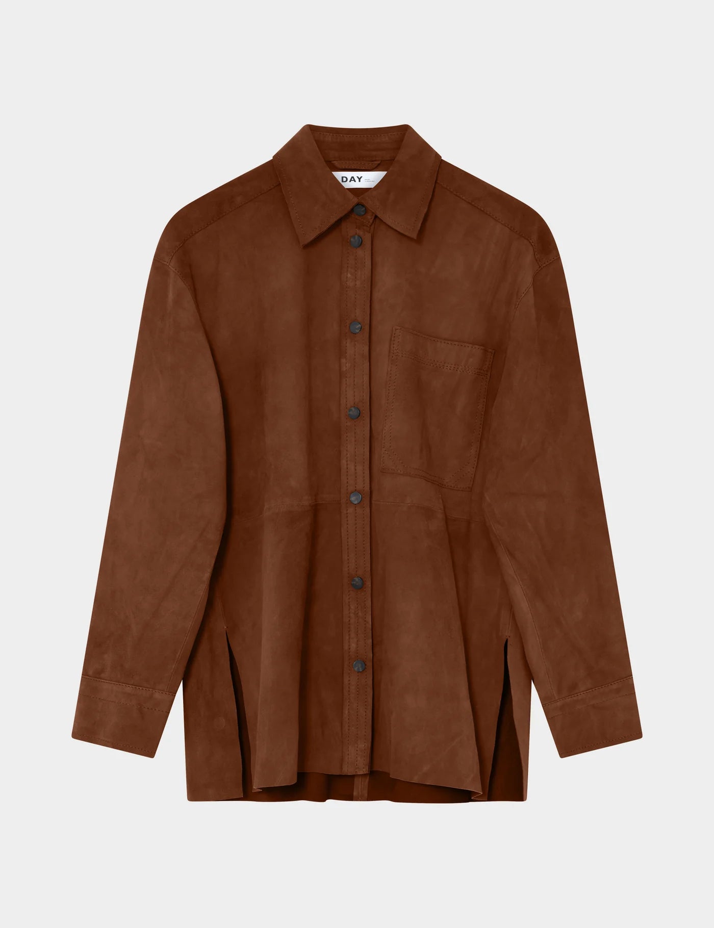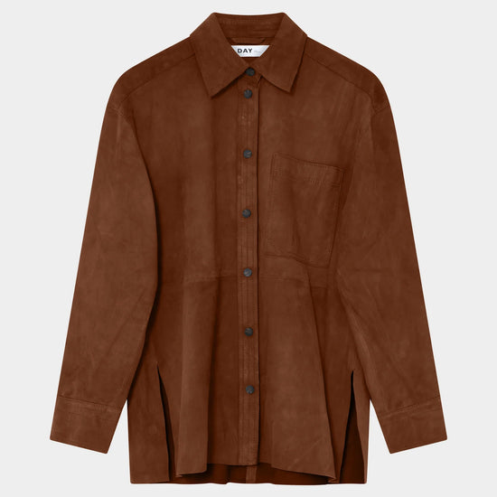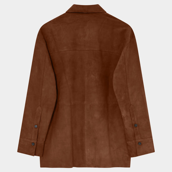 Made from the softest suede leather in a warm Caramel Café hue, the Andreas Jacket from Day Birger et Mikkelsen is a modern take on the classic overshirt. Lightweight and unlined for effortless layering, it features a sharp point collar, snap button closures, and a single chest pocket for a clean, utilitarian feel.