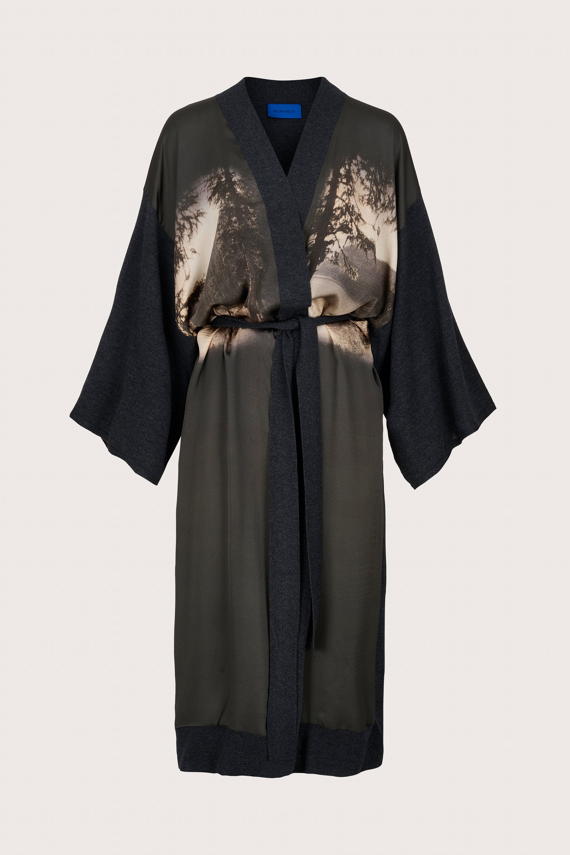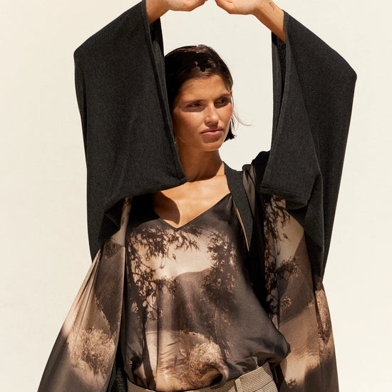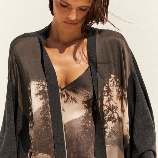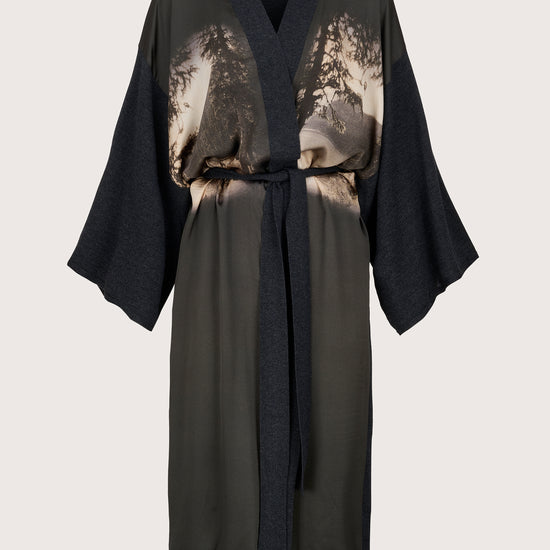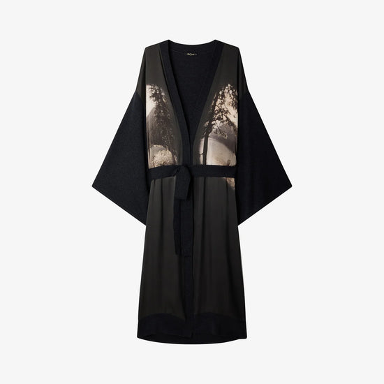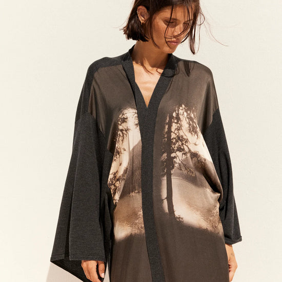 What sets it apart is the breathtaking black and white image printed on the front - a serene landscape of a lake, trees, and distant mountains, capturing a sense of stillness and quiet beauty. The mid to maxi length drapes fluidly, making this piece feel both cocooning and refined.