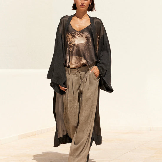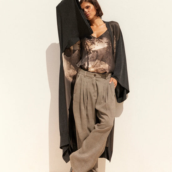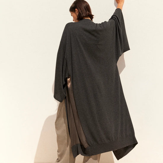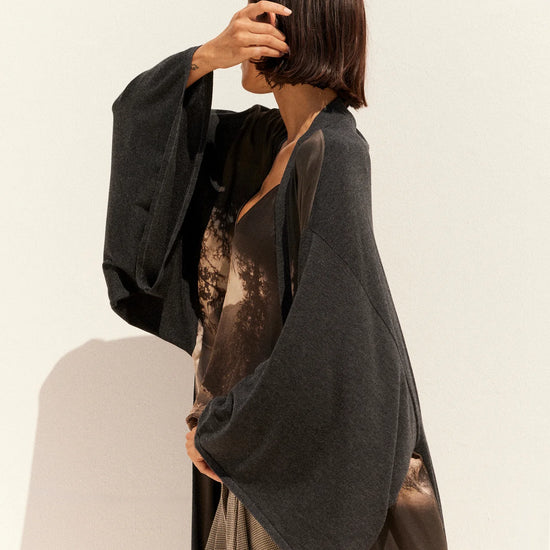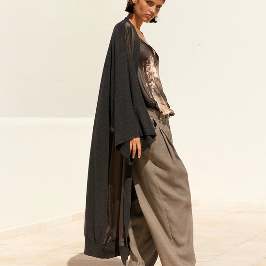 A striking blend of comfort and artistry, the Angus Kimono Knit in Black from Mes Demoiselles is a truly special piece that feels as luxurious as it looks. Made in a super soft deep charcoal grey knit, this kimono-style long cardigan features a V-neckline, wide sleeves, and a wrap silhouette secured with a self-tie belt for effortless elegance.