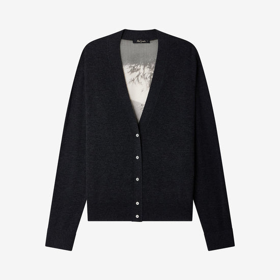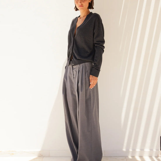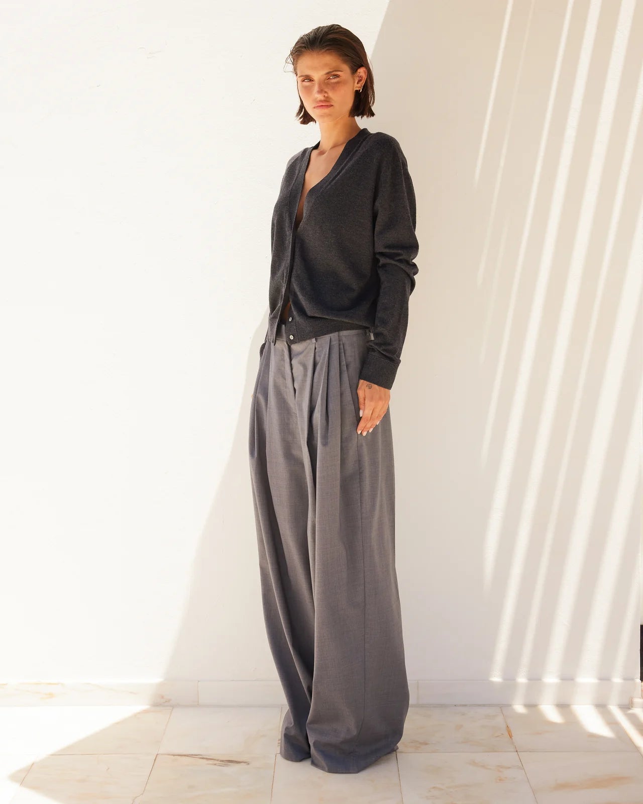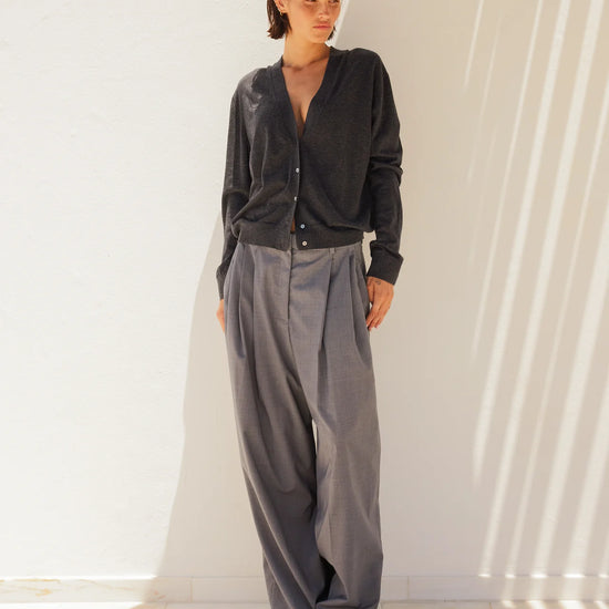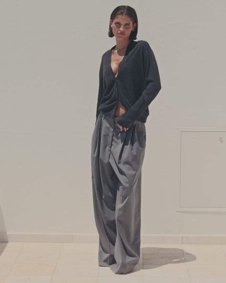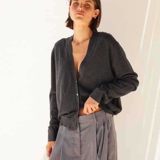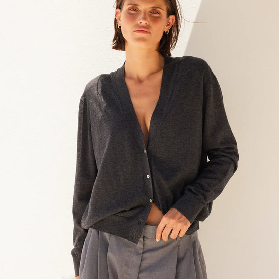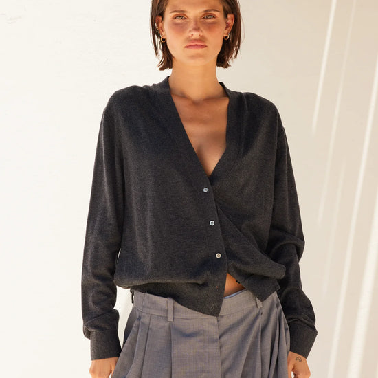 Elegant simplicity meets artistic expression in the Argy Cardigan in Black from Mes Demoiselles. This cardigan-style jacket features a timeless V-neckline, long sleeves with single-button cuffs, small grey buttons, and a softly ribbed hem, creating a beautifully understated front silhouette.
