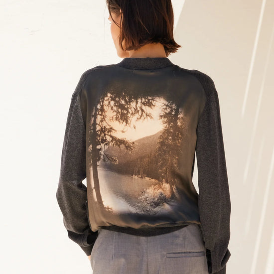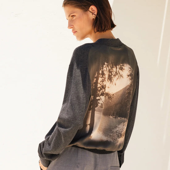 But the true magic lies in the back - a breathtaking black and white landscape depicting a still lake and surrounding trees, printed with a dreamy, almost mystical quality. The serene imagery evokes a sense of calm and quiet wonder, making this piece as poetic as it is wearable.