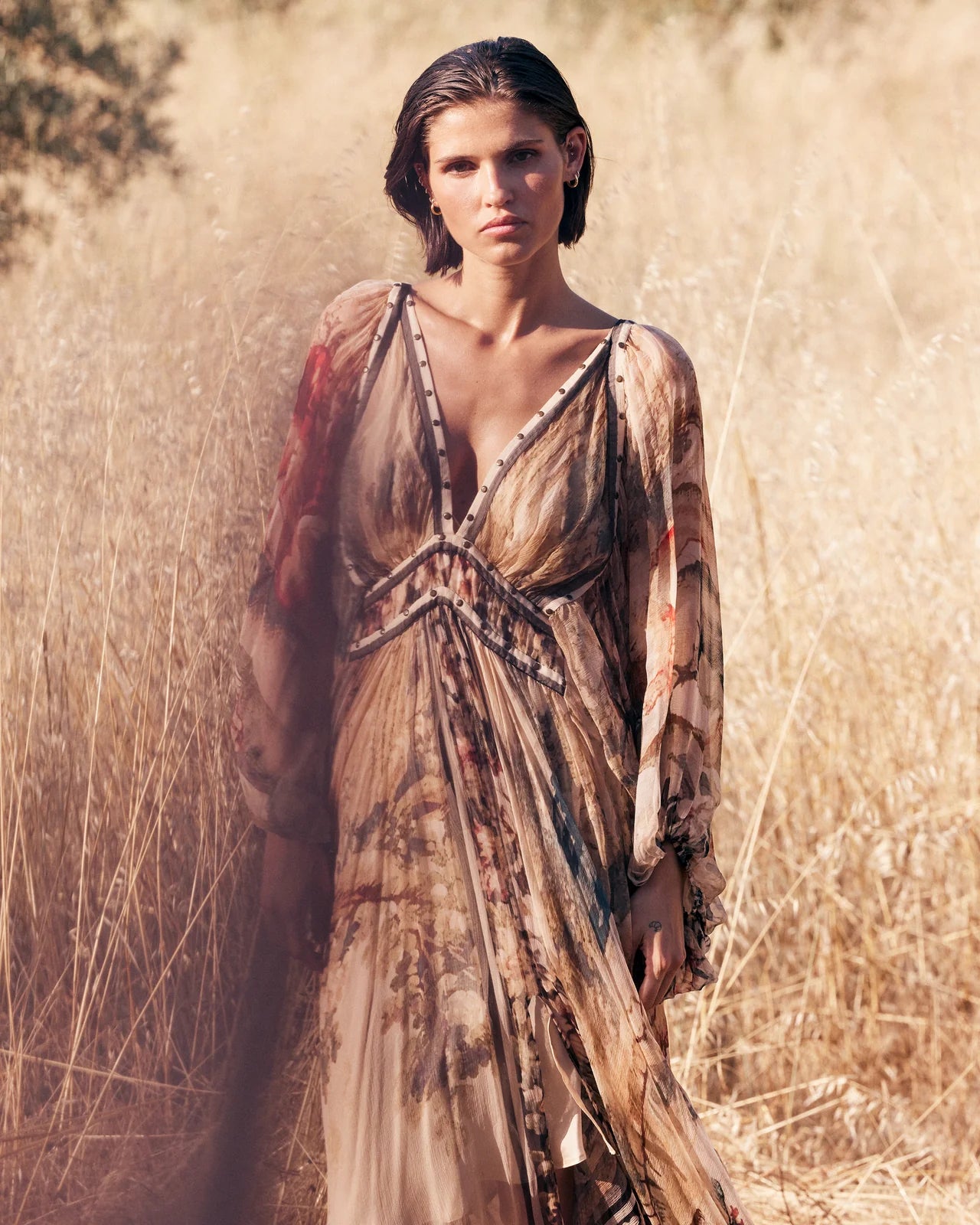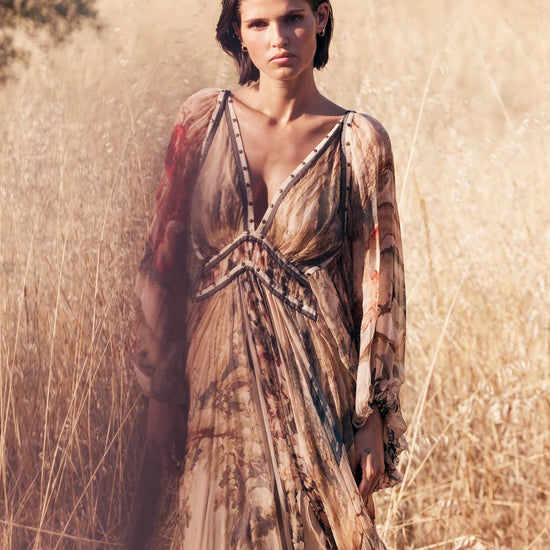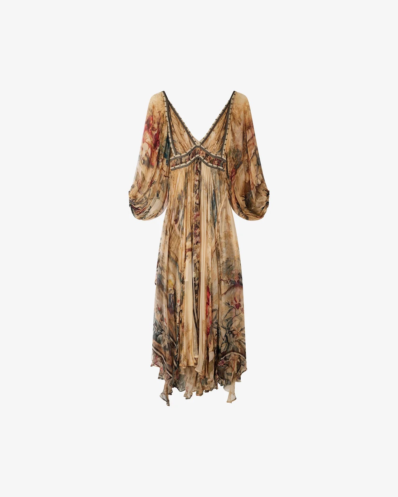 Romantic and effortlessly ethereal, the Aum Dress in Multi from Mes Demoiselles is a showstopping piece that captures the essence of bohemian elegance. Designed with a flattering V-neckline, the dress features antique-style stud detailing along the neckline and just under the bust, adding a touch of vintage charm and structure.
