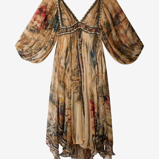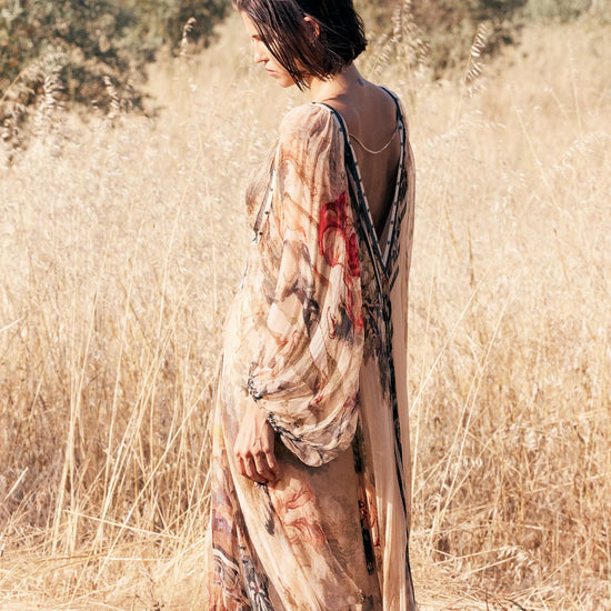 The voluminous sleeves are uniquely split underneath, creating graceful movement and an airy, fluid silhouette. A waterfall hem adds soft drama to the lined, mid-length design, ensuring it flows beautifully with every step.