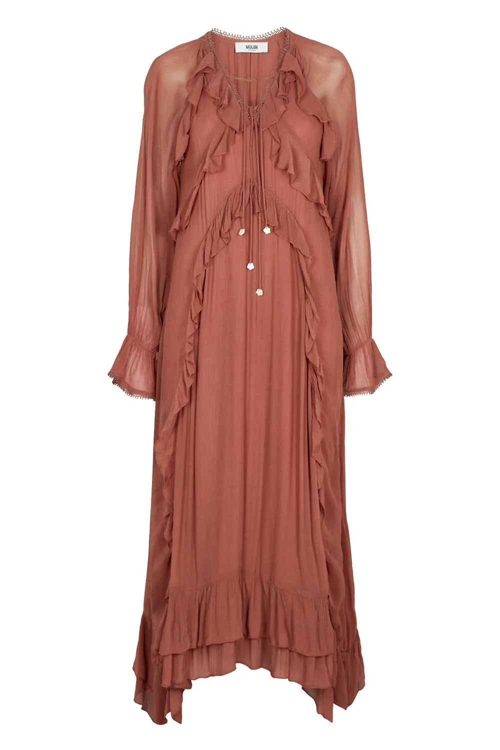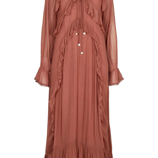 The Beatrice Dress Henna by Moliin is a striking blend of romantic detail and relaxed elegance. Designed in a gorgeous henna-inspired burnt orange terracotta hue, this flowing dress features delicate ruffle detailing that cascades down the bodice and skirt, adding soft texture and movement throughout. The sheer long sleeves are finished with elasticated cuffs for subtle volume, while the body is fully lined for comfortable, effortless wear.