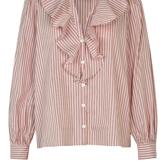 Made from light, smooth cotton with all-over stripes, this shirt combines effortless wearability with delicate detailing. It features a flattering V-neckline framed by a subtle frill trim, adding a romantic edge to the relaxed silhouette. The button-through front keeps the look refined and versatile.