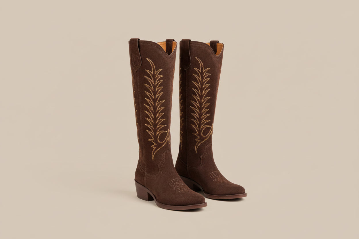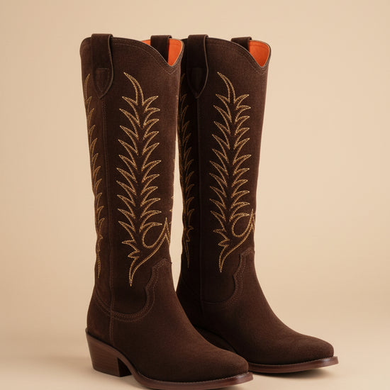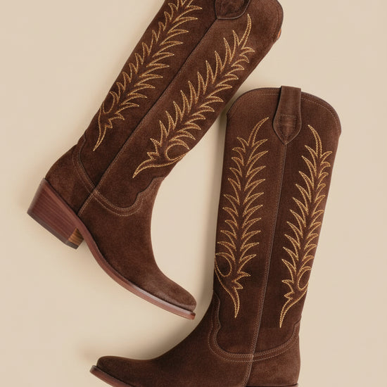 Upgrade your western-inspired wardrobe with the Blanca Suede Embroidered Boot Chocolate from Penelope Chilvers. Handcrafted from rich chocolate-brown suede, this long-length cowboy boot offers a refined take on a classic western silhouette, making it a timeless addition to your wardrobe.