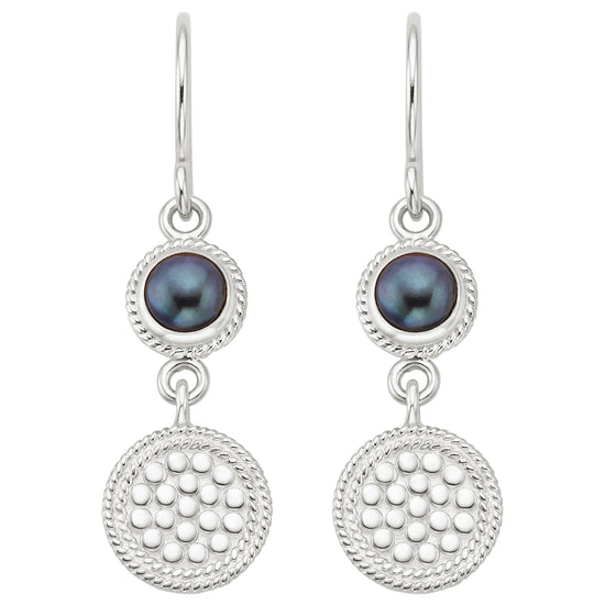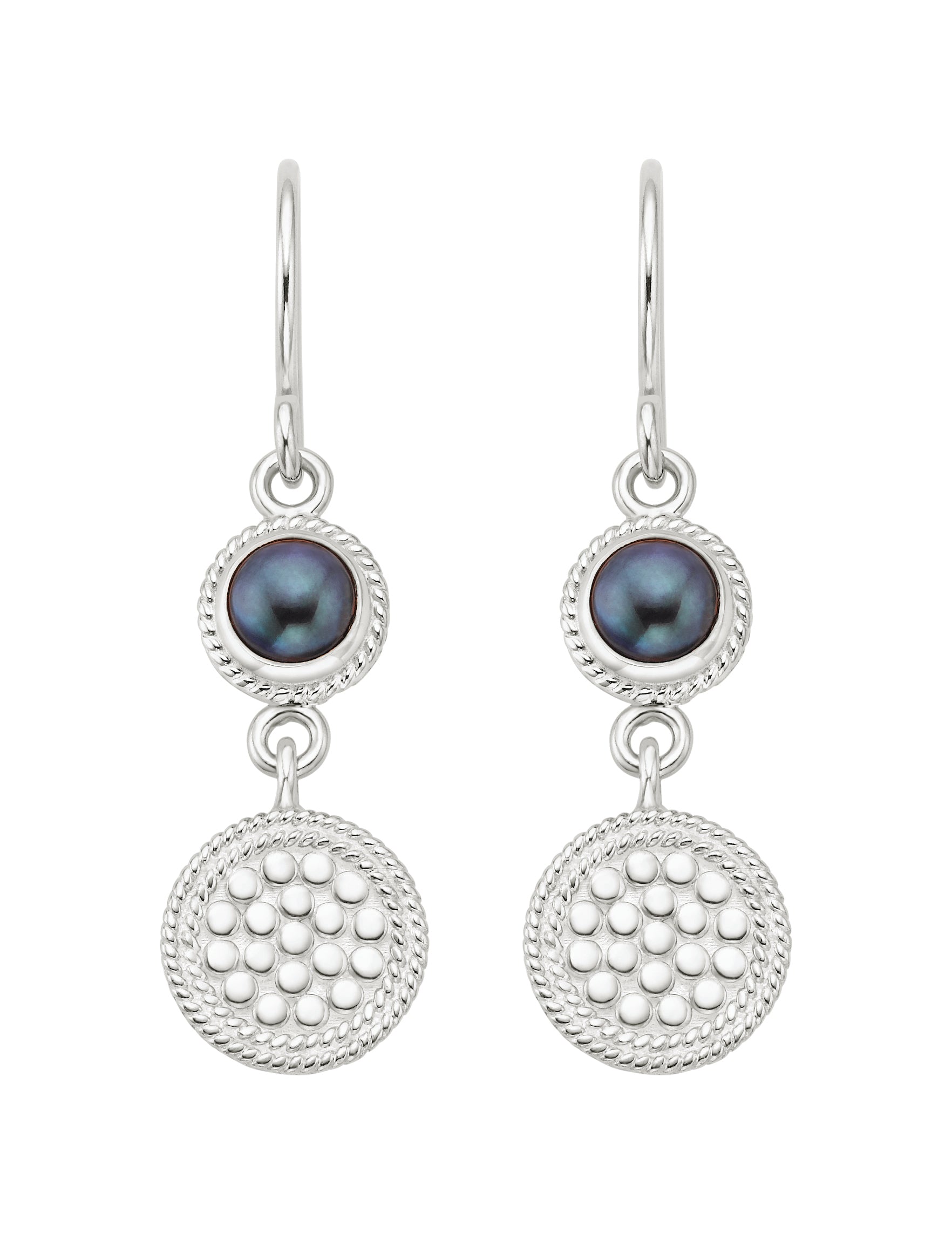 Featuring a striking double-drop silhouette, these earrings pair a luminous blue pearl - encased in polished silver - with Anna Beck’s signature Balinese disc, adorned with the brand’s iconic hand-placed dot work. The contrast of smooth pearl and textured silver creates a look that’s both refined and meaningful.