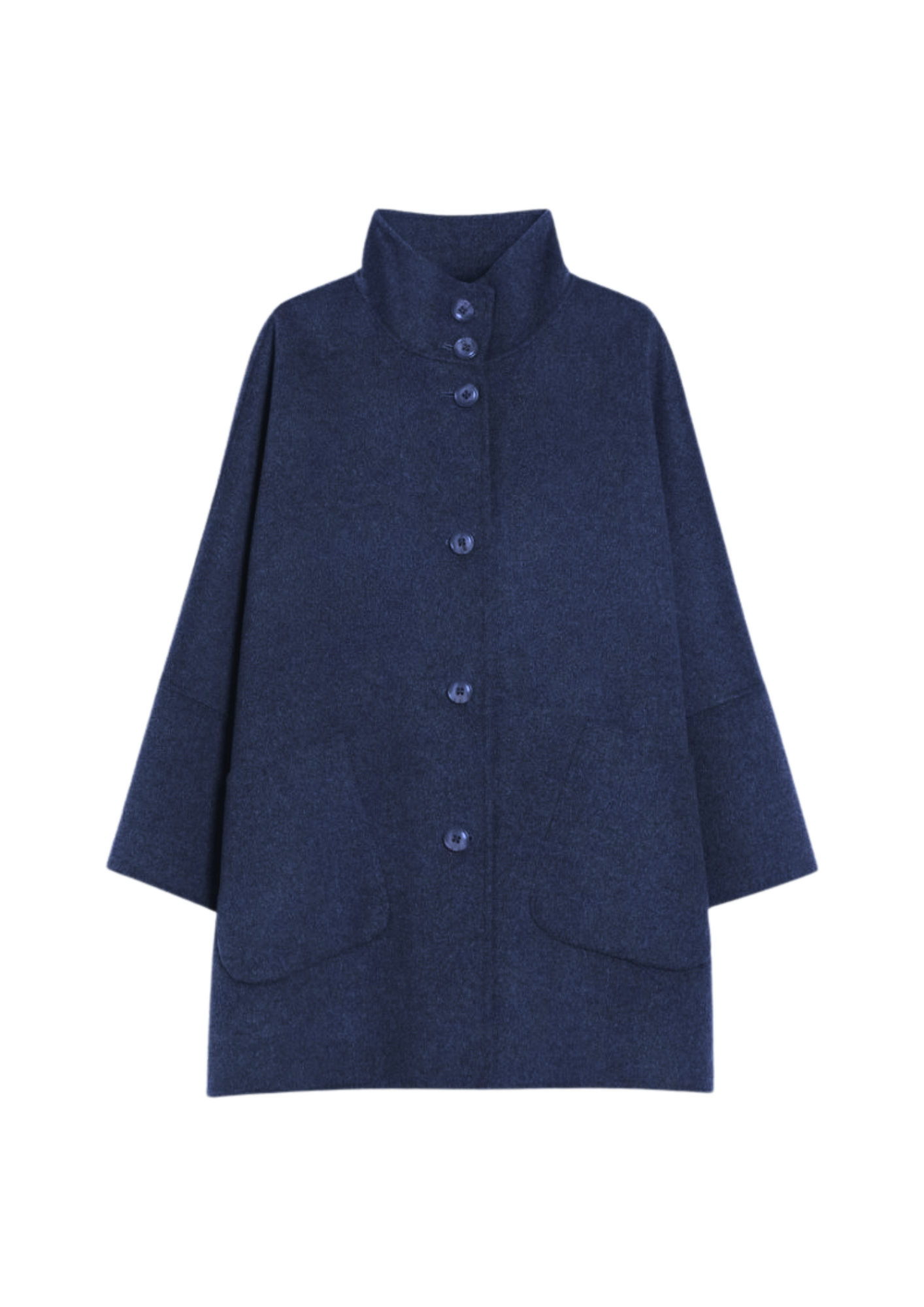 The stand collar with two buttons adds structure, while wide sleeves and side splits give the piece an easy, fluid feel. Two front patch pockets offer both style and function, and a central rear seam subtly shapes the back for a clean, modern finish. Tonal navy buttons keep the look sleek and streamlined.