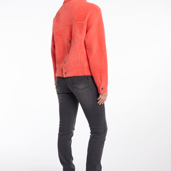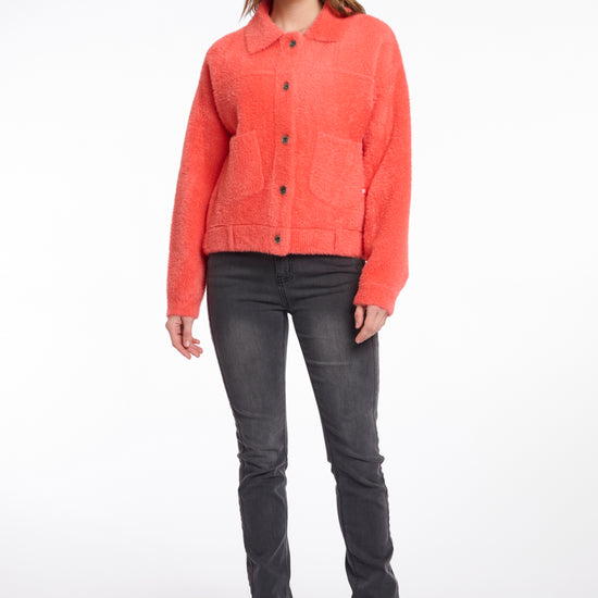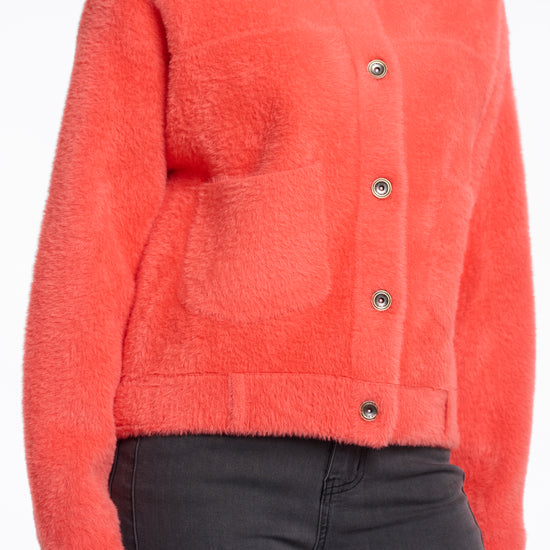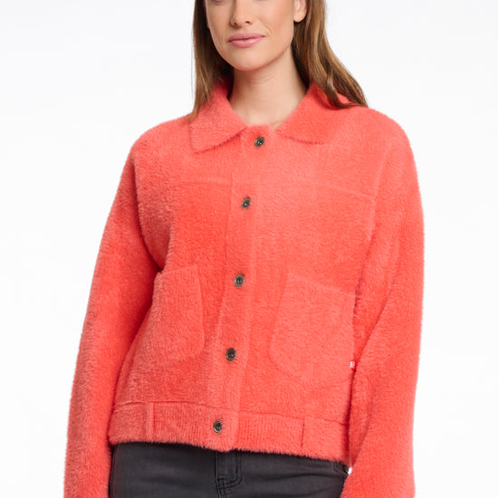 This knitted jacket features a modern boxy silhouette with a smart cutaway collar and front patch pockets that bring both style and function. The vibrant bright coral hue instantly uplifts any outfit, while metallic buttons on the front and back add just the right amount of shine and detail.