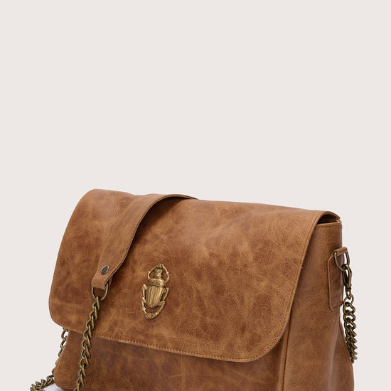 Made from gorgeous caramel-toned leather, this flap-style bag is adorned with a striking gold scarab stamp on the front - a symbol of transformation and protection that adds a unique, meaningful twist to the design. The popper button closure keeps your essentials secure, while a hidden exterior pocket beneath the flap provides added practicality.