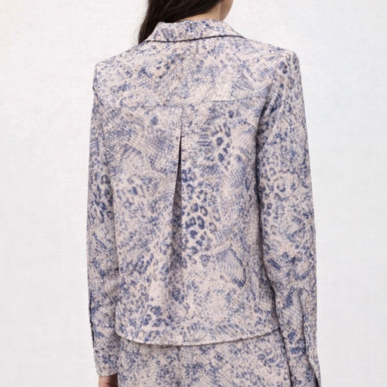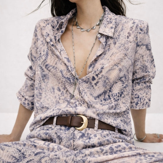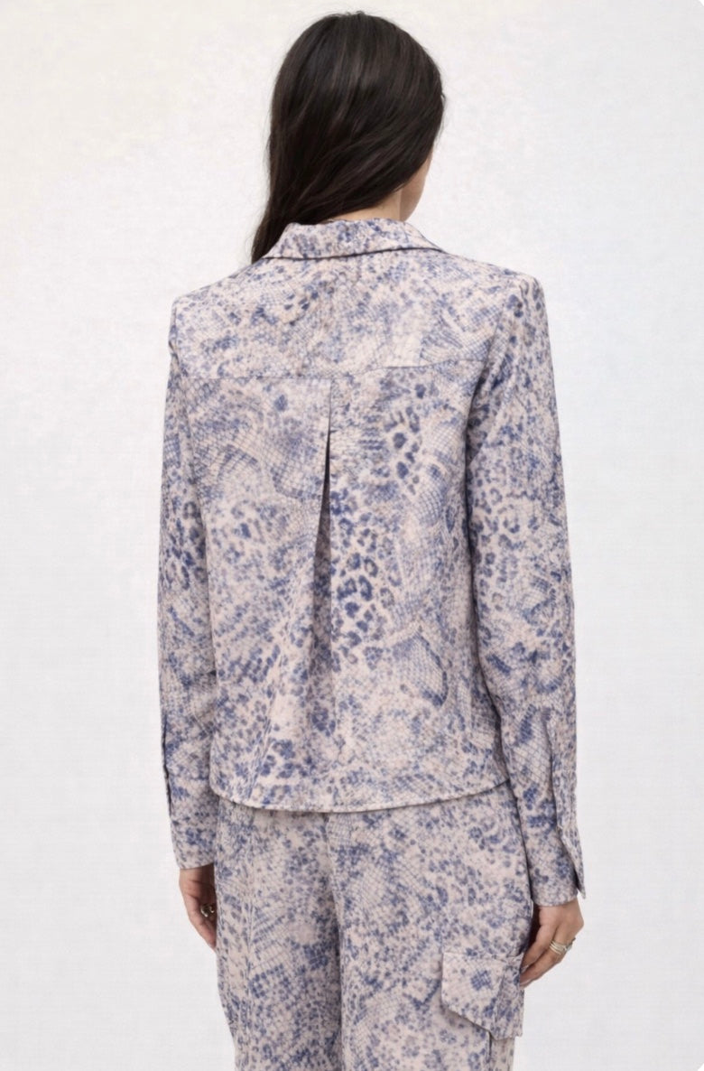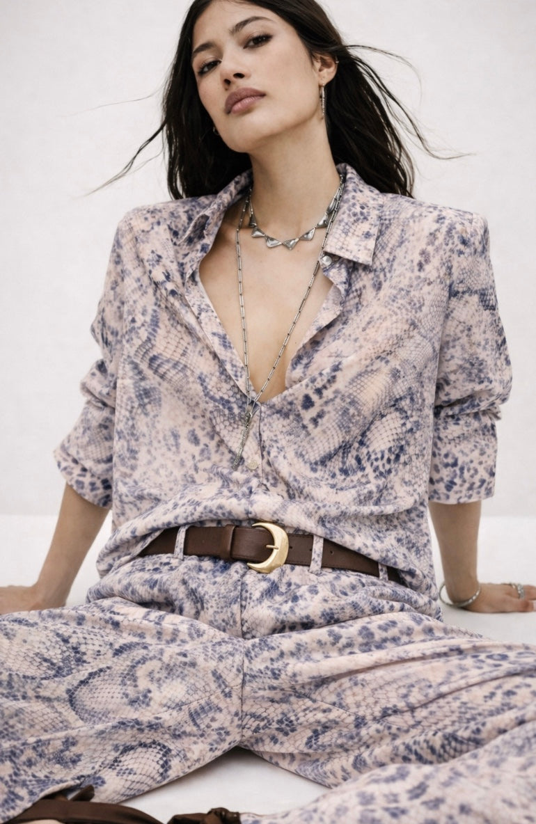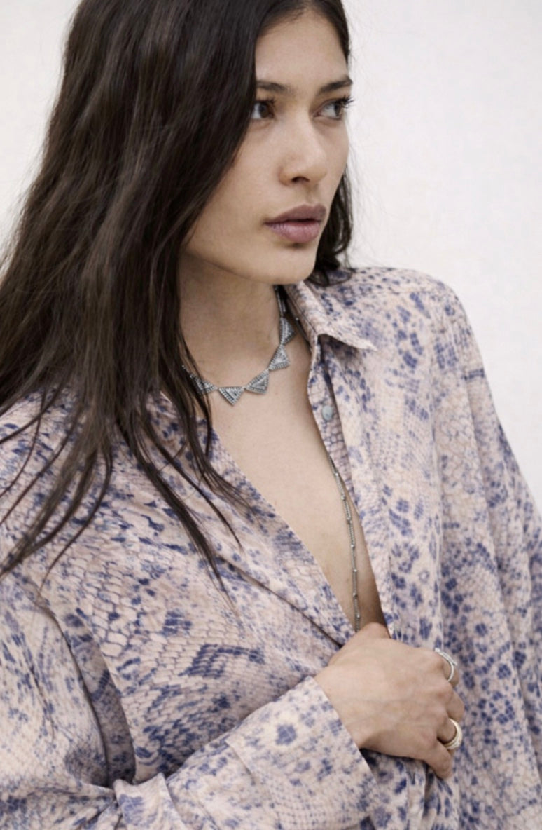 Made in a super soft polyester, the fabric feels luxurious against the skin and moves beautifully with the body. The snake skin print is brought to life through the most gorgeous tones of blue, creating a look that is both eye catching and sophisticated. Elegant yet modern, this shirt transitions effortlessly from day to evening.