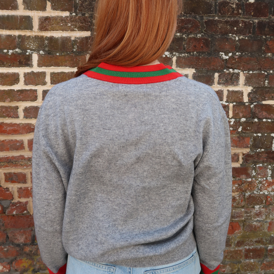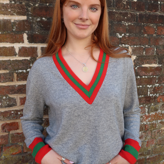 Another must have from British brand Tabitha Webb is this beautiful Cricket Jumper Grey/Red/Green. Featuring grey marl base and contrast red and green piping on the v-neck and the cuffs, this jumper is the perfect preppy knit which will be worn on repeat in your wardrobe. Cut in a luxurious cashmere mix, this cricket inspired knit not only offers classic style but is super soft against the skin. Wear yours simply with your daily denim or paired with shorts on a chilly Summer's night.