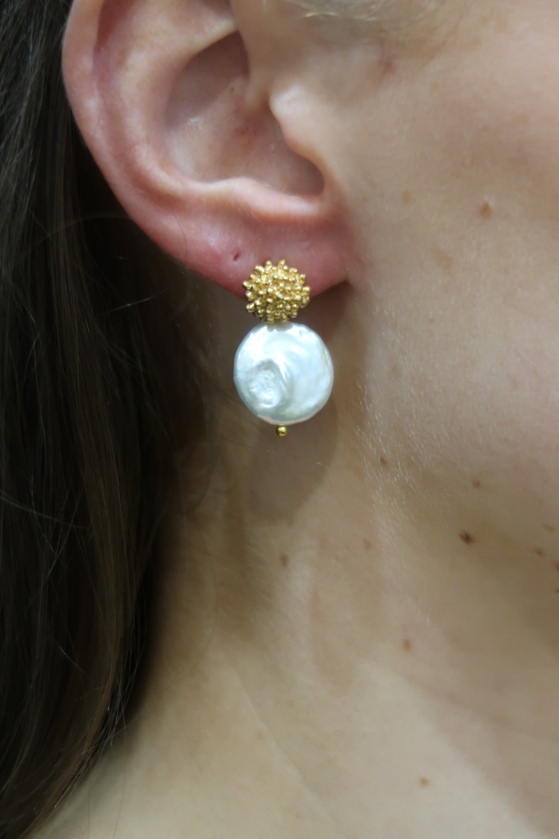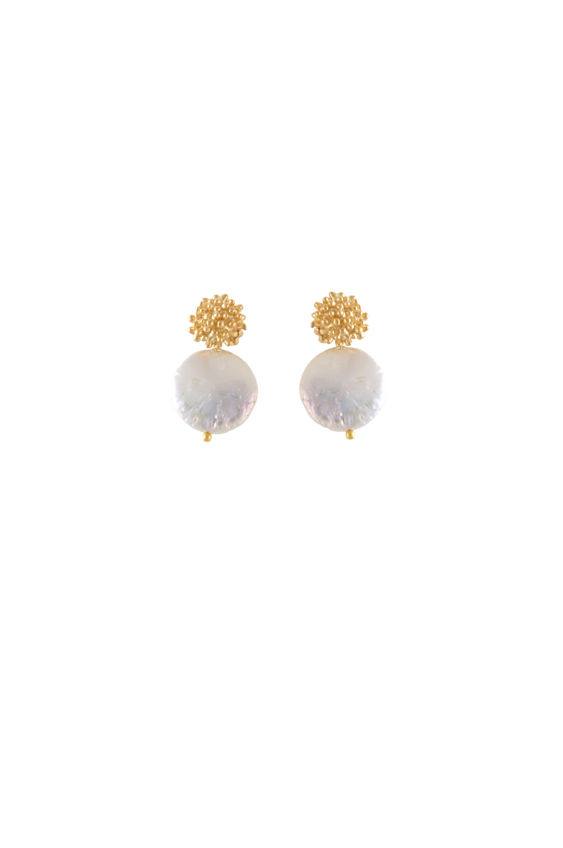 The Delicate Feminine Wave Pearl Earrings from Joanna Laura Constantine combine soft elegance with sculptural artistry. Each earring features a beautifully crafted dome-shaped circular stud, adorned with tiny ball detailing that creates a rich, textured finish. Suspended below is a flattened circular pearl drop, adding a refined touch of luminosity and gentle movement that enhances the feminine silhouette of the design.