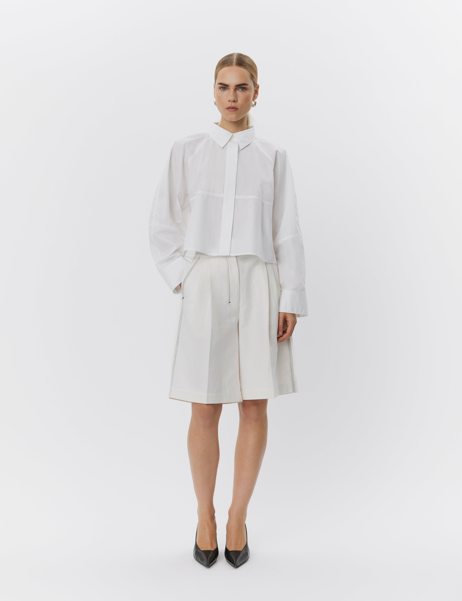 Clean, crisp, and contemporary, the Elston Shirt Bright White from Day Birger et Mikkelsen is a modern classic reimagined. Designed with a boxy, cropped silhouette, this shirt features a concealed placket for a minimalist finish, a sharp classic collar, and wide long sleeves with double-button cuffs that add subtle structure. A central horizontal seam and straight hem enhance its architectural feel, making it a refined staple for modern dressing. Crafted in a pristine bright white, it’s the perfect foundation for any capsule wardrobe.