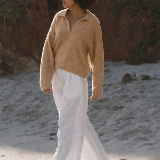 Elevate your knitwear collection with the Emma Cashmere Knit in Camel from Australian brand Lilly Pilly. Crafted from a sumptuous cashmere blend, this piece delivers the ultimate in softness and luxury without the weight. The Emma features a flattering V-neckline, subtle collar, long sleeves, and relaxed dropped shoulders that create an effortlessly chic silhouette. Versatile enough to layer or wear solo, it transitions seamlessly across seasons and occasions—pair with tailored trousers and heels for evening elegance, or throw over denim for understated ease. A wardrobe essential that's soft, timeless, and endlessly wearable.
