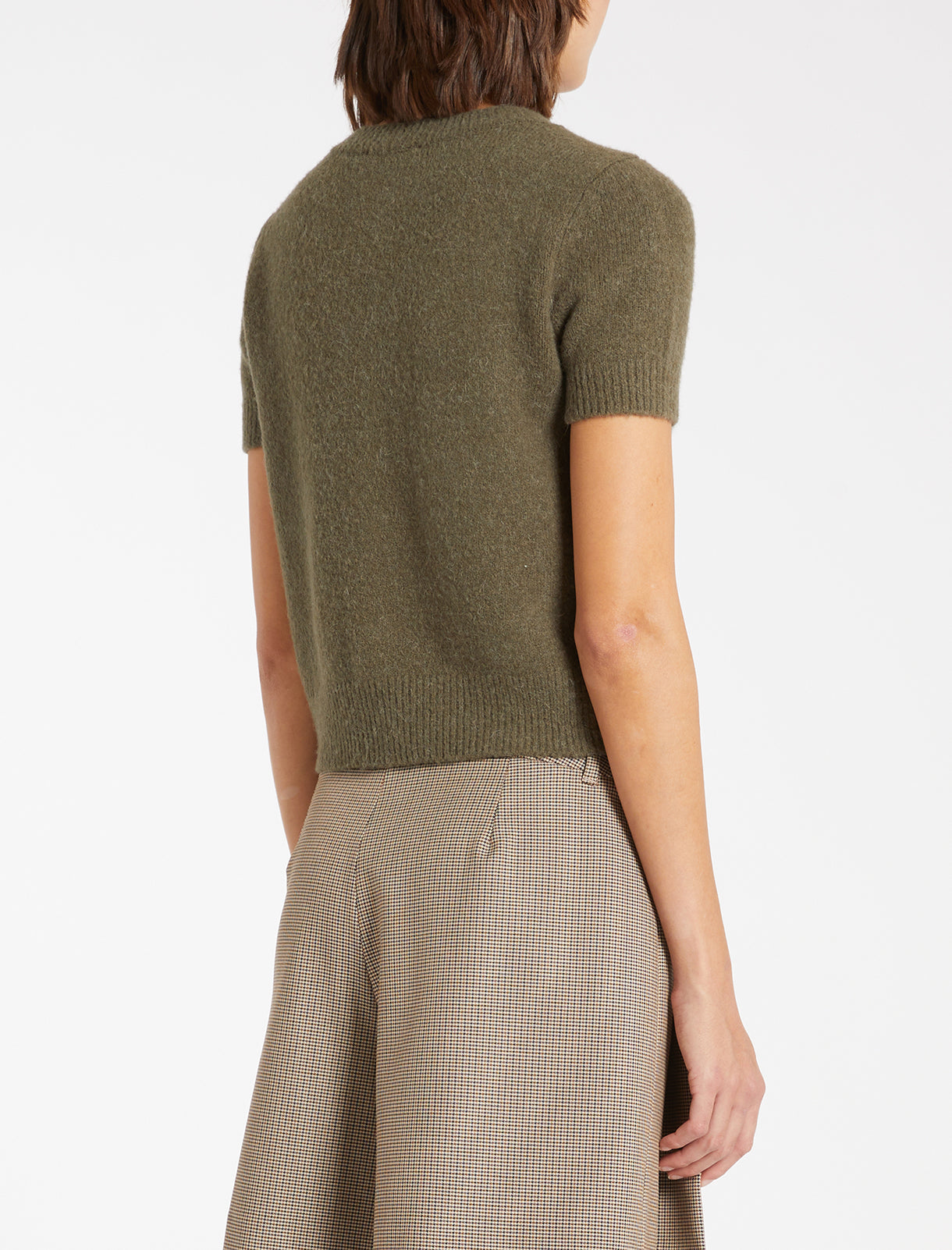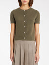 Sophisticated with a playful edge, the Fidenza Cardigan in khaki brings effortless charm to everyday dressing. Cut in a slim, slightly cropped silhouette, it features a round neckline, short sleeves, and ribbed detailing for a polished, flattering finish.