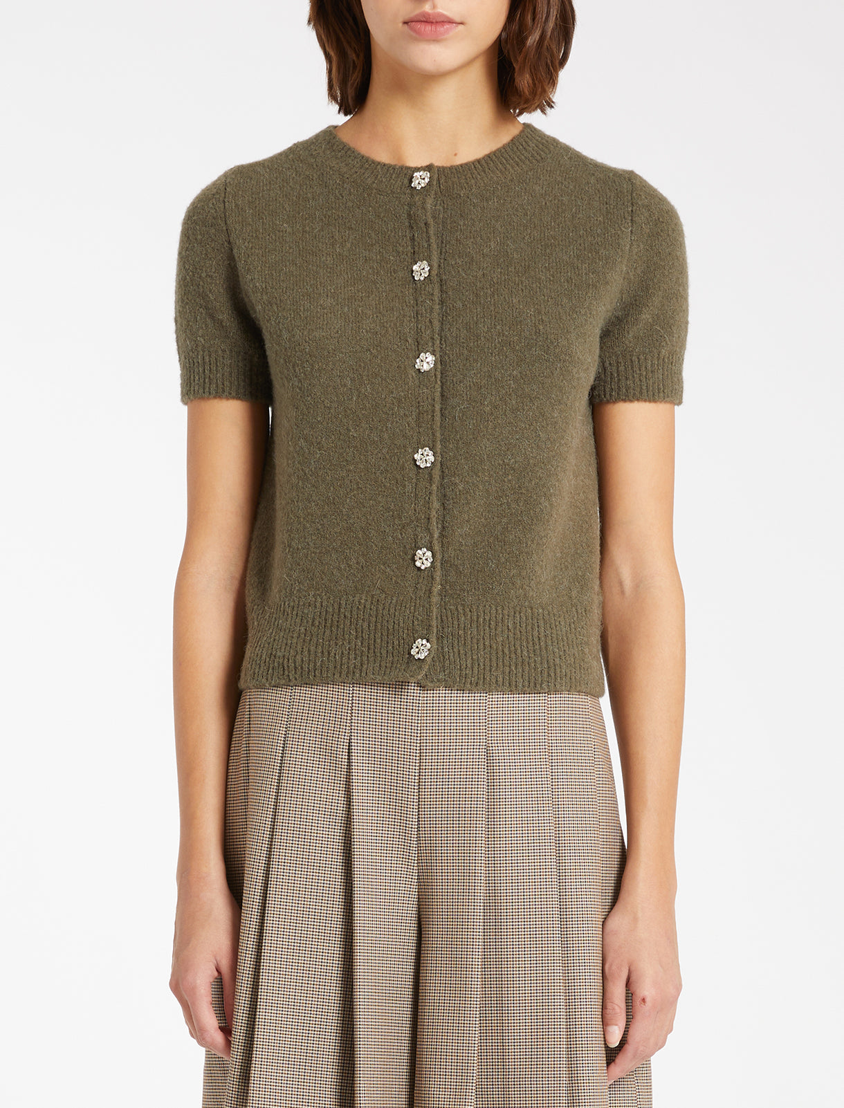 The soft khaki tone adds a modern, earthy touch, while tonal buttons maintain a clean, minimal look, while the diamonte buttons elevate this versatile knit with a hint of unexpected glamour.