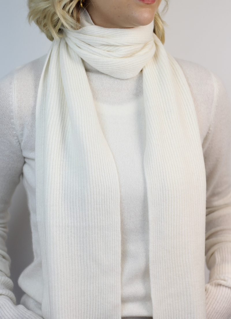 The Glenbarr Cashmere Scarf White Ice is a luxurious ribbed 100% cashmere scarf from our own brand Sass & Edge. Made from the softest and finest long staple Mongolian cashmere, this scarf is sure to keep the chills away this winter. In a beautiful winter white, this knit will work perfectly styled with the matching Renwick Fishermans Cashmere Beanie in White Ice!