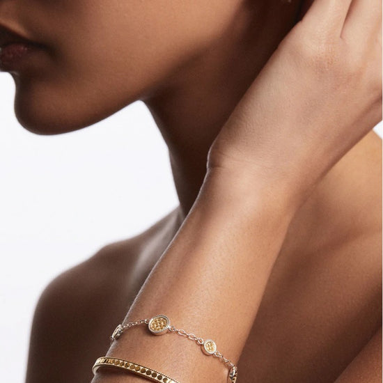 The contrast of warm gold and cool silver creates a sophisticated, eye-catching piece that transitions effortlessly from everyday wear to special occasions. Whether worn solo for a subtle statement or layered within your bracelet stack, this bracelet brings timeless elegance to any jewellery collection.
