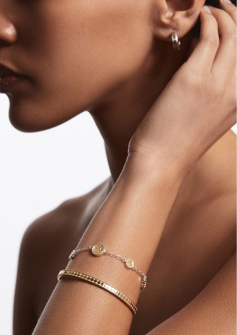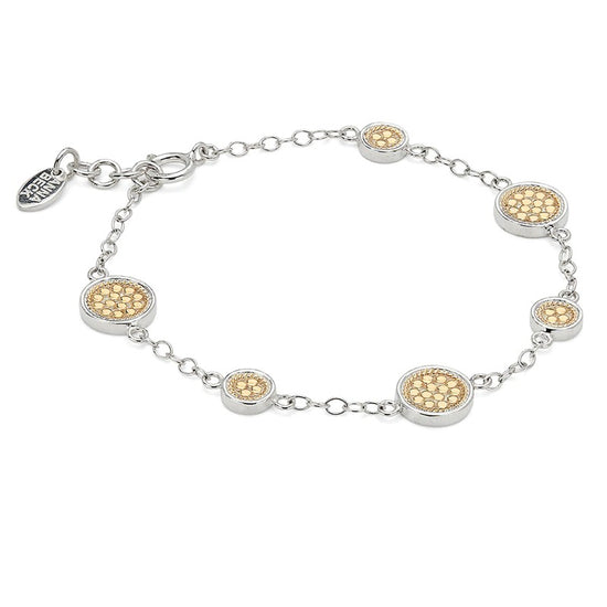 Elegant and enduring, the Classic Station Bracelet Gold & Silver from the Anna Beck Classic Collection is a true celebration of handcrafted design and mixed-metal harmony. Featuring a delicate sterling silver chain adorned with alternating gold-plated circle stations in two sizes, this bracelet is finished with Anna Beck’s signature hand-placed dot detailing in radiant 18k gold plating on sterling silver.