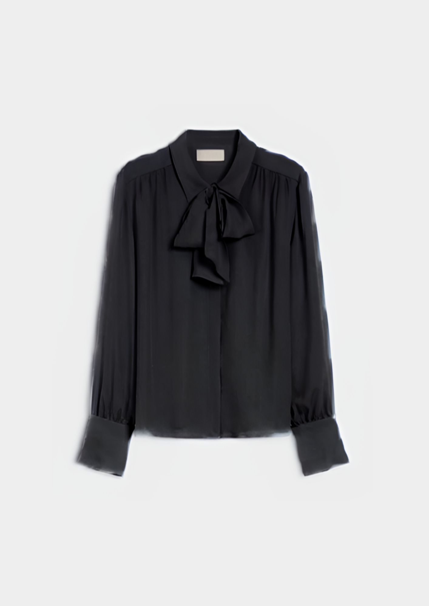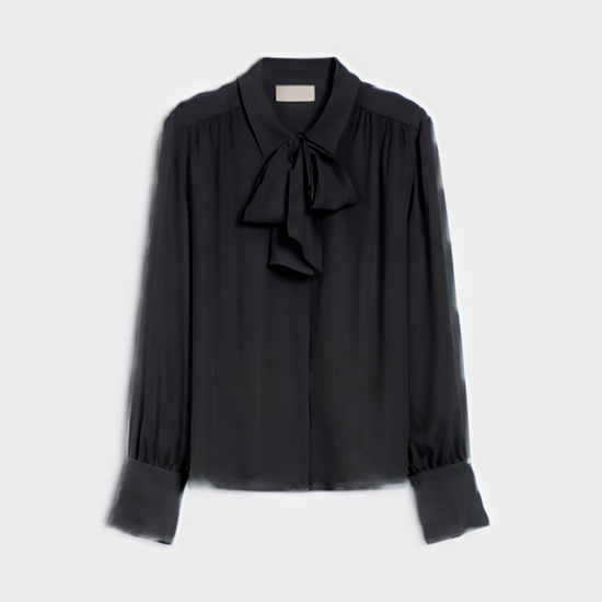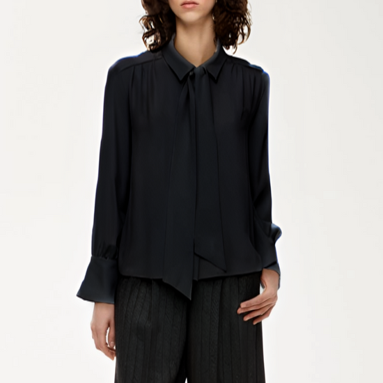 At the heart of its design is a small collar paired with a removable neck tie - a versatile detail that lets you shift from romantic softness to sharp, contemporary edge with ease. Gathered accents at the shoulders and back lend subtle structure, while long sleeves with wide, ruched cuffs and a concealed button placket keep the finish sleek and refined.