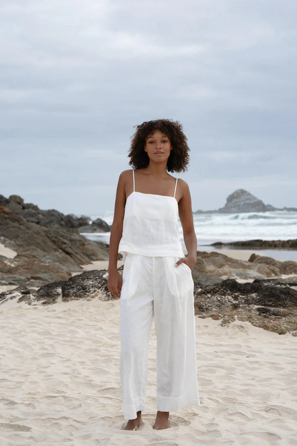 Made from 100% organic linen, the Ivy Linen Crop Trouser Ivory by Australian label Lilly Pilly offers a perfect balance of relaxed elegance and everyday ease. Designed with a wide leg silhouette and a cropped length, they feature a flat front waistband with an elasticated back for all day comfort, plus functional side and back pockets for added practicality.