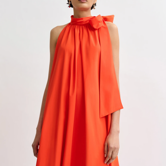 Cut in a relaxed A-line shape, it creates a flattering, elongated line without feeling restrictive. The high neckline is finished with a refined front knot detail, adding subtle sculptural interest to the clean design. Discreet slit pockets are seamlessly integrated, keeping the look polished while adding everyday practicality.