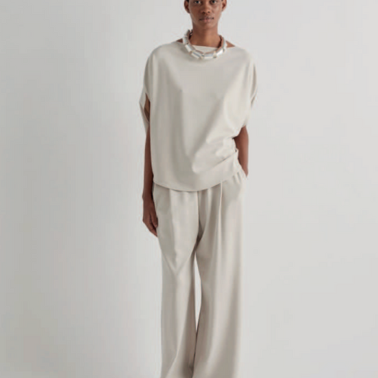 Elevate your casual wardrobe with these Jersey Drape Trousers in Birch by MeiMeij. Featuring a contemporary wide-leg cut and subtle pleat detailing, these trousers blend comfort with understated sophistication. The soft jersey fabric pairs with a fully elasticated waist for all-day ease, while the neutral birch tone effortlessly coordinates with any top—from fitted basics to oversized knits. Perfect for transitioning from relaxed weekends to polished occasions, these versatile trousers deliver style without compromise. A wardrobe essential that works as hard as you do.