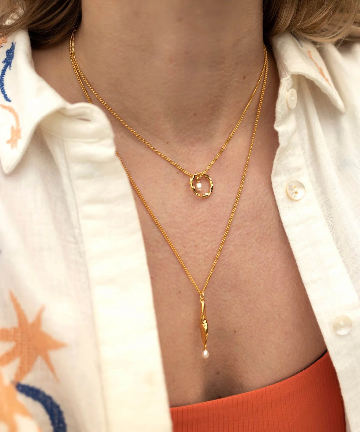 The Volcano Hoop Necklace Pearl Gold from Claudia Bradby is a beautiful, nature inspired design, drawing influence from the mighty Icelandic volcanoes. This elegant gold hoop necklace features a free running pearl charm, making it the perfect piece for everyday wear. Its understated yet striking design is ideal for layering, especially when paired with the gold pearl toggle necklace, for an elevated, chic pearl style. The tactile quality of the gold hoop connects us to the raw power of nature, adding a meaningful touch to this timeless piece.