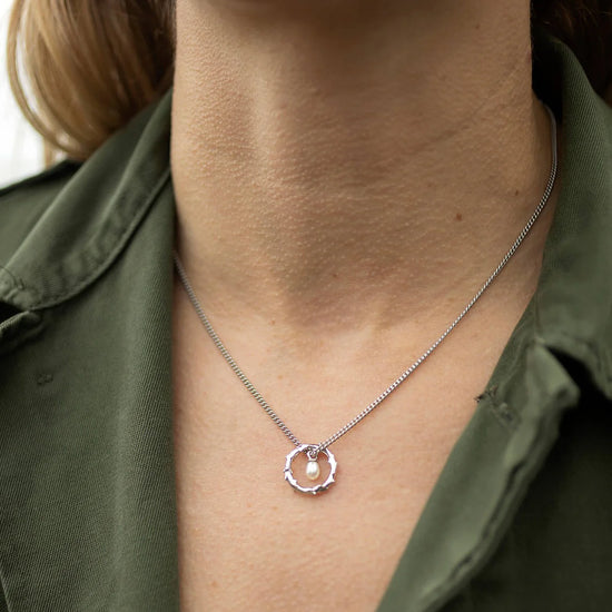 The Volcano Hoop Necklace Pearl Silver from Claudia Bradby draws inspiration from the raw energy of Icelandic volcanoes. This sleek silver hoop necklace features a free moving pearl charm, making it a versatile and elegant choice for everyday wear. When layered with the silver pearl toggle necklace, it creates a sophisticated and elevated pearl style. The tactile nature of the silver hoop offers a unique connection to nature’s strength, making this necklace not only a beautiful accessory but also a meaningful one. A timeless piece that effortlessly blends simplicity and elegance.
