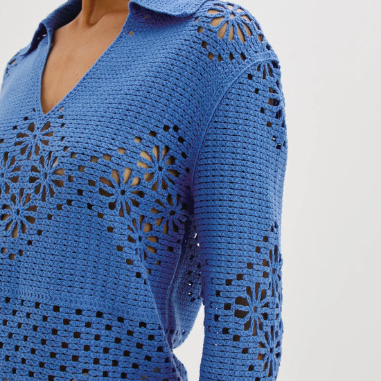 Elevate your everyday wardrobe with the Louiza Top French Blue by Rails. Made from breathable cotton crochet fabric and accented with delicate eyelet detailing, this lightweight pullover blends casual ease with refined texture. The striking cobalt blue hue adds a bold pop of colour, while the relaxed fit ensures all-day comfort. Featuring a flattering V-neckline, long sleeves, and a classic collar, the Louiza top effortlessly combines laid-back charm with feminine sophistication - perfect for everything from weekend brunches to vacation strolls. Wear yours with high-waisted denim and sandals for a polished daytime look, or pair it with white linen trousers and woven slides for an effortlessly chic, resort-ready outfit. For cooler evenings, layer it under a lightweight blazer or tuck it into a midi skirt for a touch of elevated elegance.
