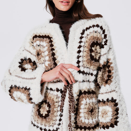 The design features a white base with intricate chocolate brown crochet motifs, creating a rich, earthy palette perfect for cooler days. The round neckline and open front keep the silhouette relaxed, while the twisted, multi-tone drawstring belt allows you to cinch the waist for a flattering, feminine shape.