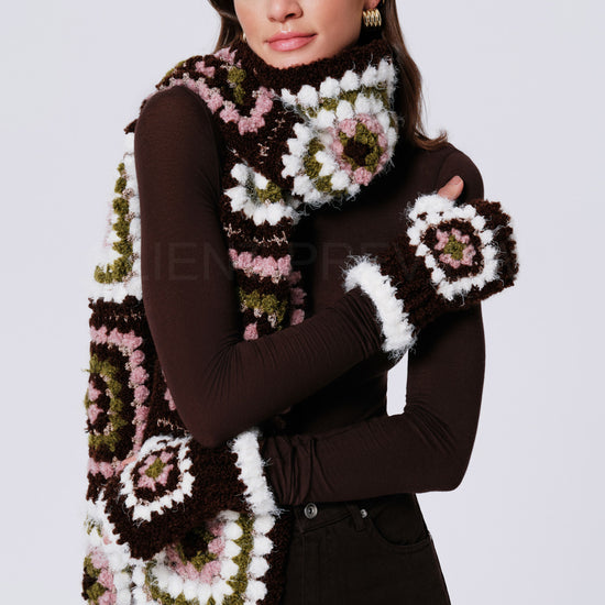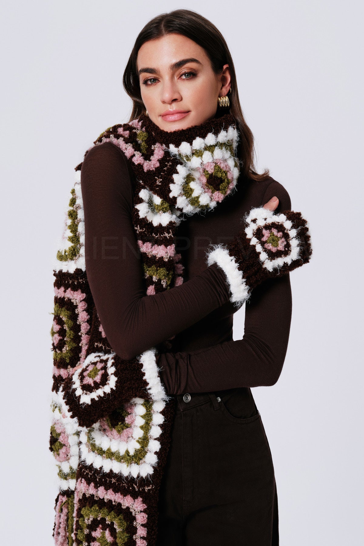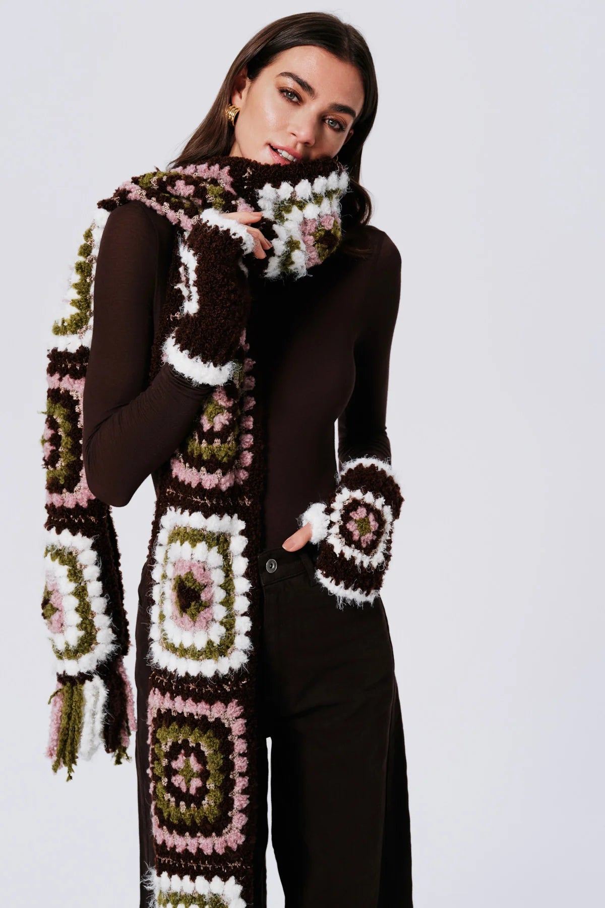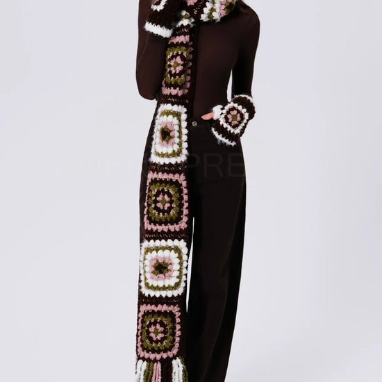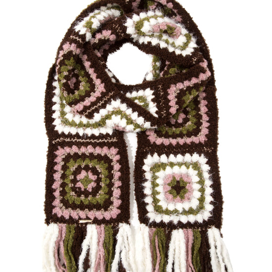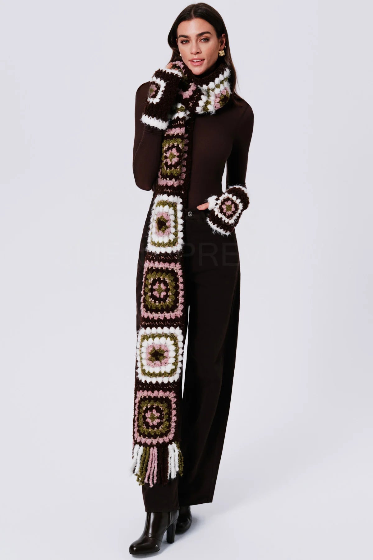 Set against a rich chocolate brown background, the design features square crochet motifs in vibrant pink tones, pieced together in a striking block pattern that feels both modern and nostalgic. Tassels at each end add a fun, boho-inspired finish that moves beautifully as you walk.