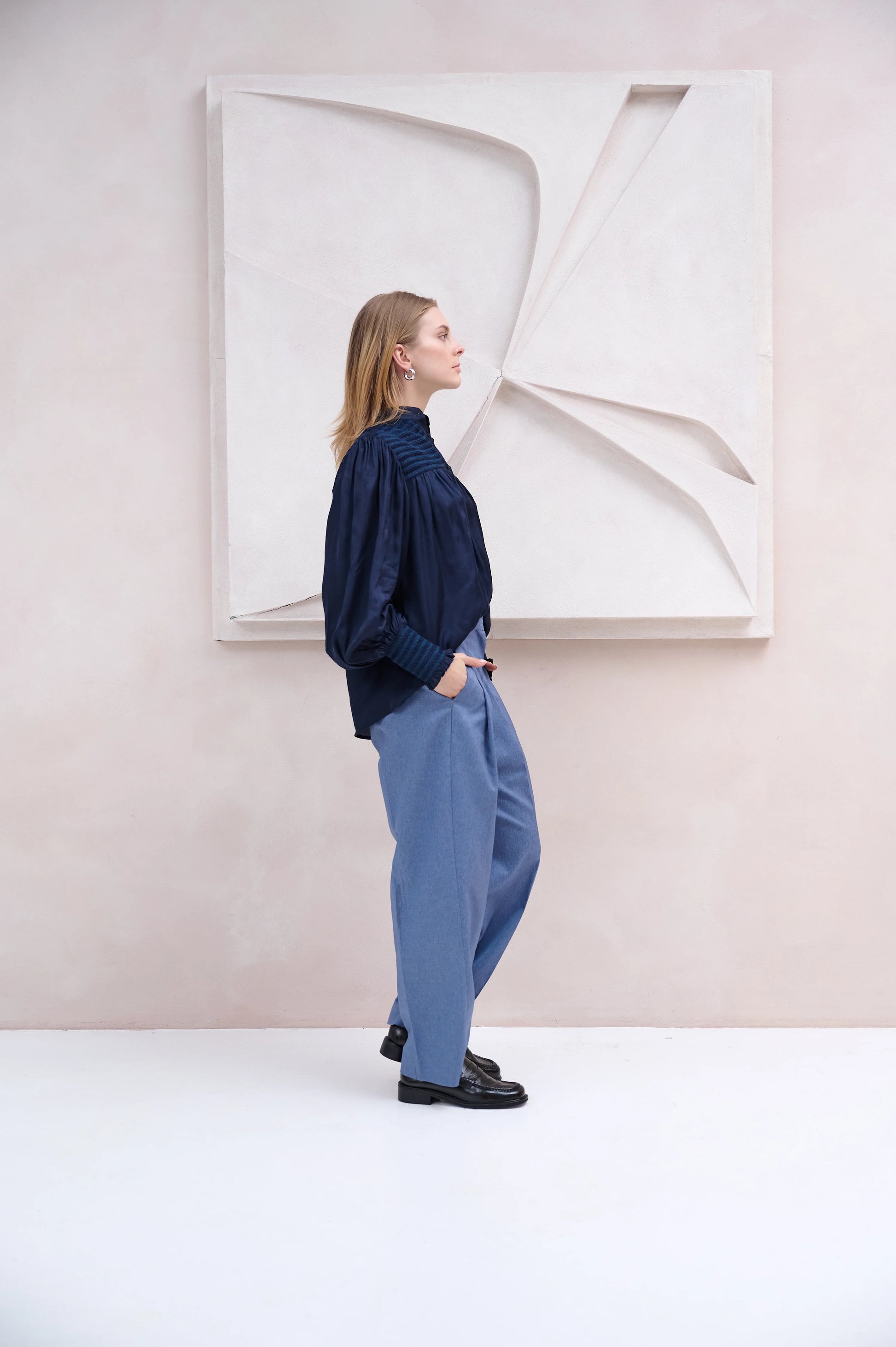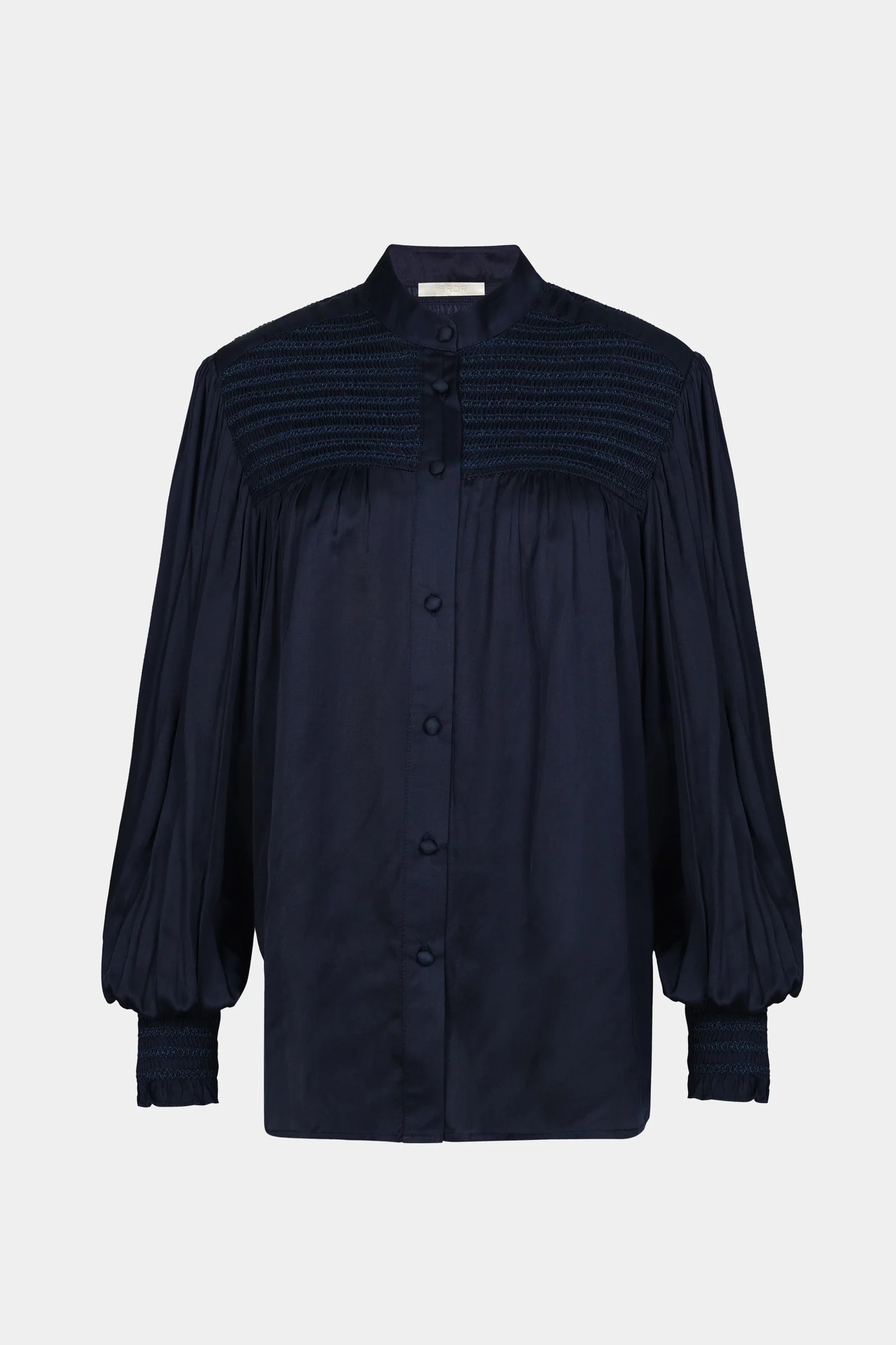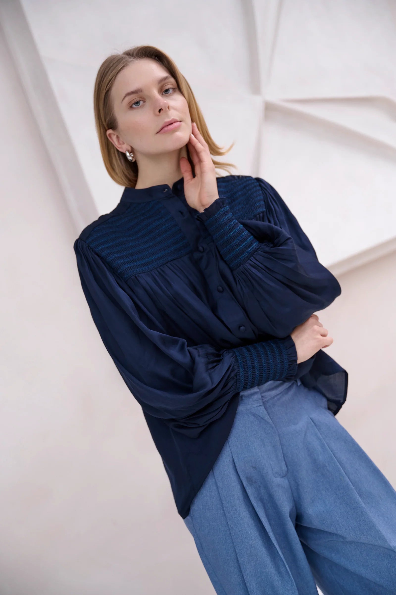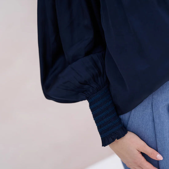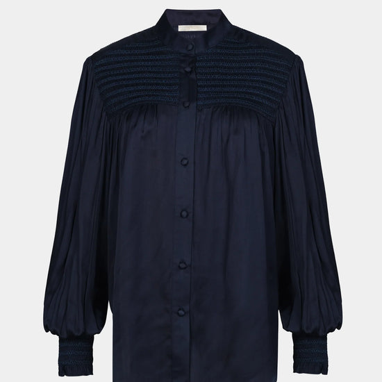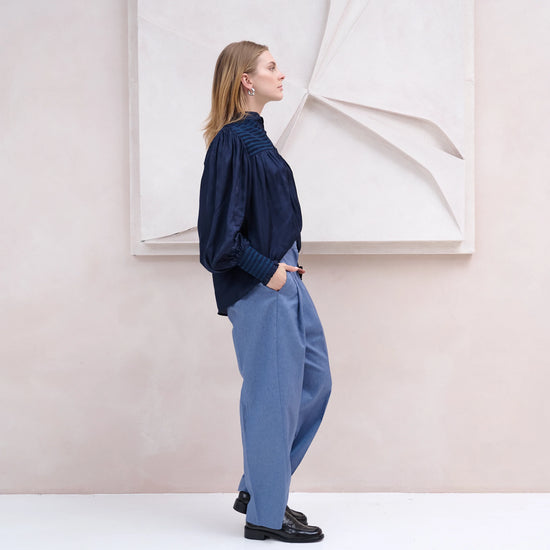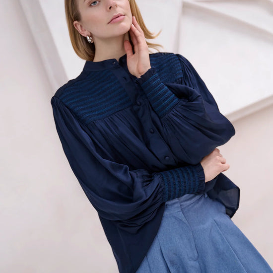 The cuff is neatly fitted to balance the shirt’s gentle volume, while gathered detailing at the back yoke adds ease and movement. Designed in a rich, deep navy hue, the Melaine Shirt offers understated sophistication with a focus on finish, fit, and feel.