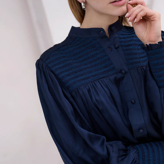 A refined take on everyday dressing, the Melaine Shirt in Navy by BRDR combines soft texture with thoughtful tailoring. Made from lightweight 100% modal, this fluid shirt is detailed with all-over smocking across the front, back, and sleeve cuffs - creating subtle texture and dimension while maintaining a relaxed, elegant drape.