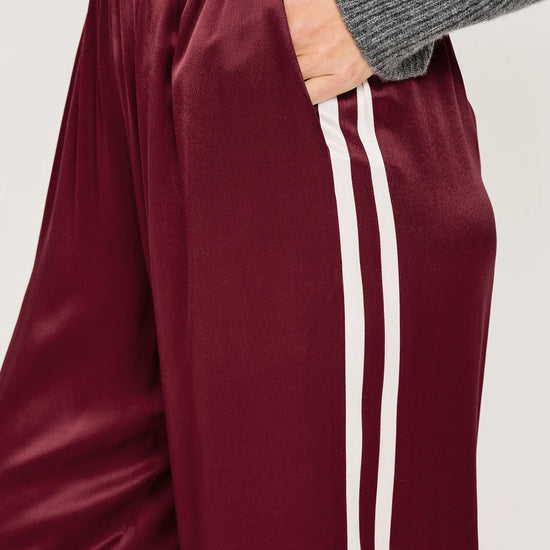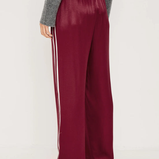 The Merida Trousers Garnet from Rails bring a luxurious twist to the classic track pant. Made from fluid crepe with a lustrous satin finish, they move effortlessly with every step, combining comfort with refined sophistication. The elasticated waistband ensures an easy, flattering fit, while the wide-leg silhouette creates a dramatic yet relaxed shape. Elegant double side stripes add a touch of sporty contrast, enhancing their modern appeal.