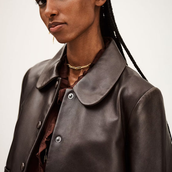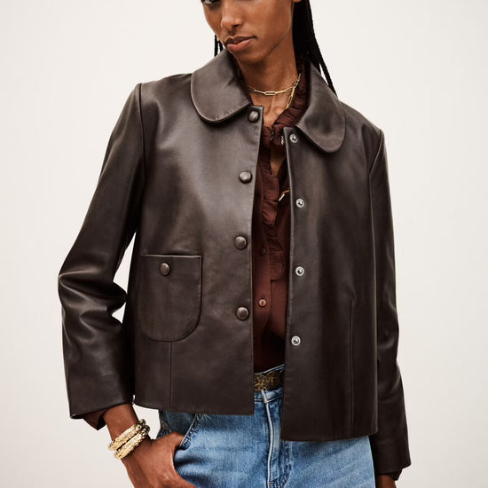 Designed with bracelet-length sleeves and a row of leather-covered popper closures, the Milo features a timeless Peter Pan collar and a single patch pocket for subtle vintage charm. Its structured yet feminine silhouette makes it endlessly versatile and easy to style.