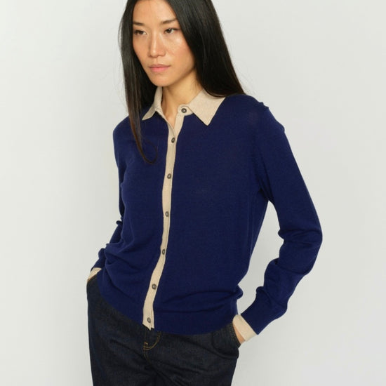 The design features a structured collar, long sleeves, and refined ribbed detailing at the cuffs and hem, adding subtle texture and shape. Sleek tonal buttons run down the front, blending seamlessly into the navy knit for a clean, minimalist finish.