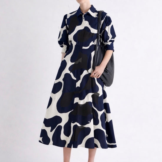 Timeless Abstract Print Cotton Dress by MeiMeij designed for year-round versatility and effortless style. The structured shirt-dress silhouette features a button-through collared bodice with subtle pleating that flatters without constraining, while the flowing A-line skirt provides graceful movement. Perfect for transitioning between seasons, this piece works equally well for daily wear, professional settings, or special occasions. Pair with flats, loafers, or boots depending on the season for a polished, put-together look that never goes out of fashion.