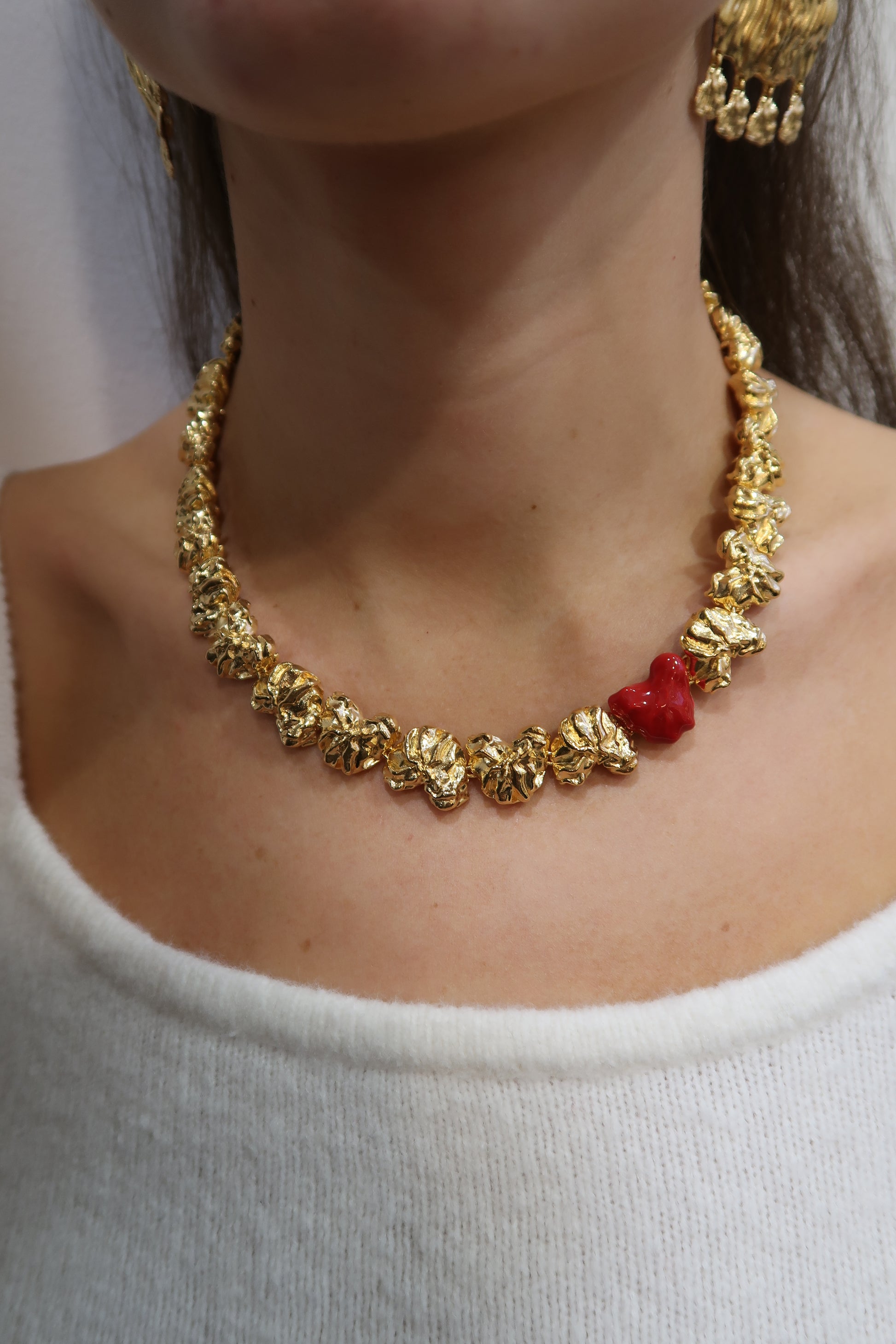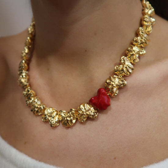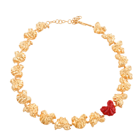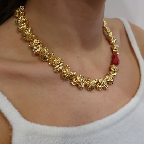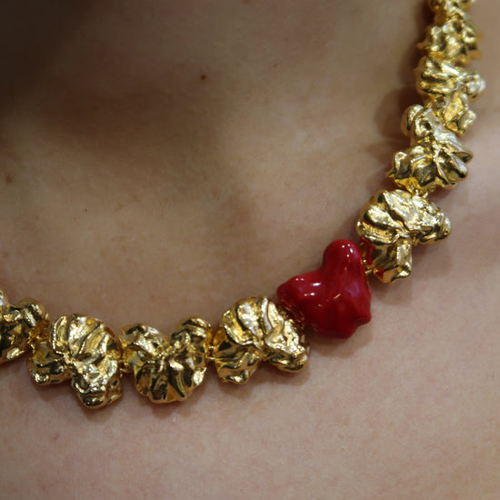 The Multi Mini Heart Wave Necklace from Joanna Laura Constantine is a charming, expressive piece that blends playful design with refined craftsmanship. The necklace features a series of uniquely shaped, textured hearts arranged in an alternating upward and downward pattern, creating a dynamic wave-like effect along the neckline. Among the gold-toned hearts sits a single glossy red heart, adding a bold pop of colour and a touch of whimsy to the piece.