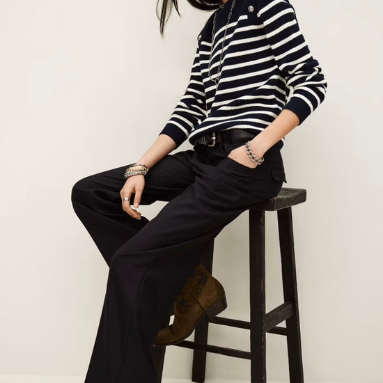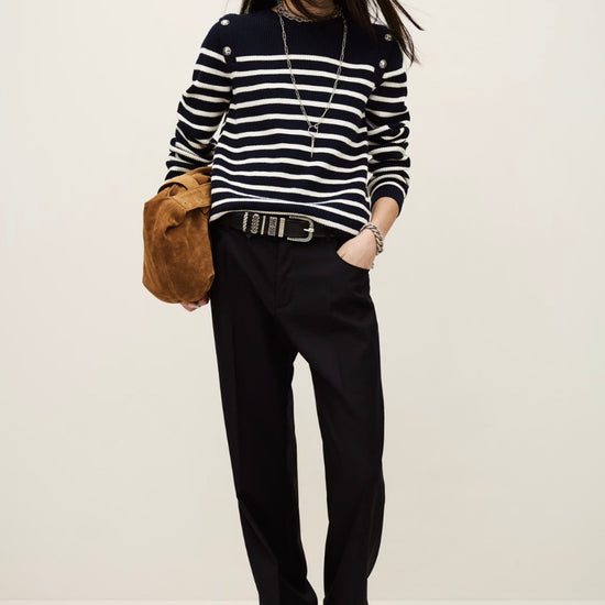 Nives Navy Trousers from BA&SH offer timeless sophistication with a straight leg cut that flatters every frame. Crafted in a classic navy shade, these versatile trousers transition seamlessly from office to evening wear. The structured silhouette provides a polished, professional appearance whilst maintaining comfort throughout the day. Perfect for building a capsule wardrobe, they pair effortlessly with blazers, shirts, and knitwear. Invest in a wardrobe staple that delivers enduring style and reliability season after season.
