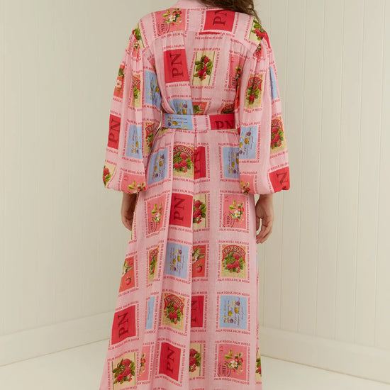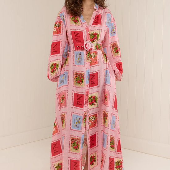 The Noddy Dress Strawberry Stamp - Palm Noosa is a fresh take on effortless summer dressing, crafted from 100% Premium Linen in the exclusive Portofino Polka Dot print. This relaxed midi dress features a pale pink background adorned with a whimsical strawberry stamp print in delicate pink and blue hues, finished with the signature Palm Noosa logo for a playful, yet elevated touch.