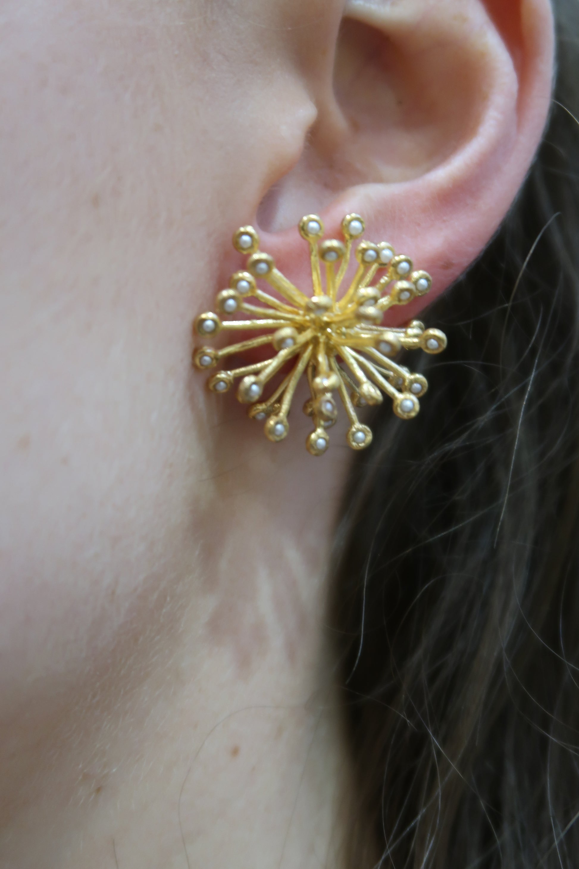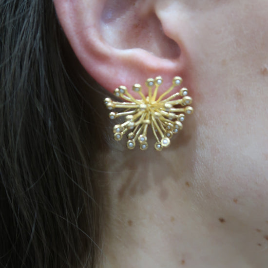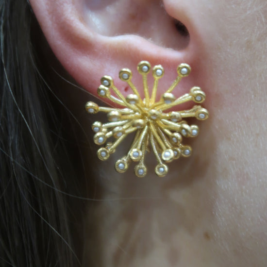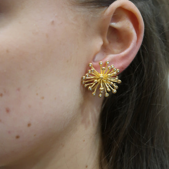 The Polen Pearl Earrings from Joanna Laura Constantine are a striking blend of bold design and delicate detailing. Each earring features a sculptural, three-dimensional dome accented with radiating gold spikes, creating a dramatic, modern silhouette. At the tip of every spike sits a tiny pearl, adding a soft, luminous contrast to the edgy form and highlighting the brand’s signature balance of femininity and statement style.