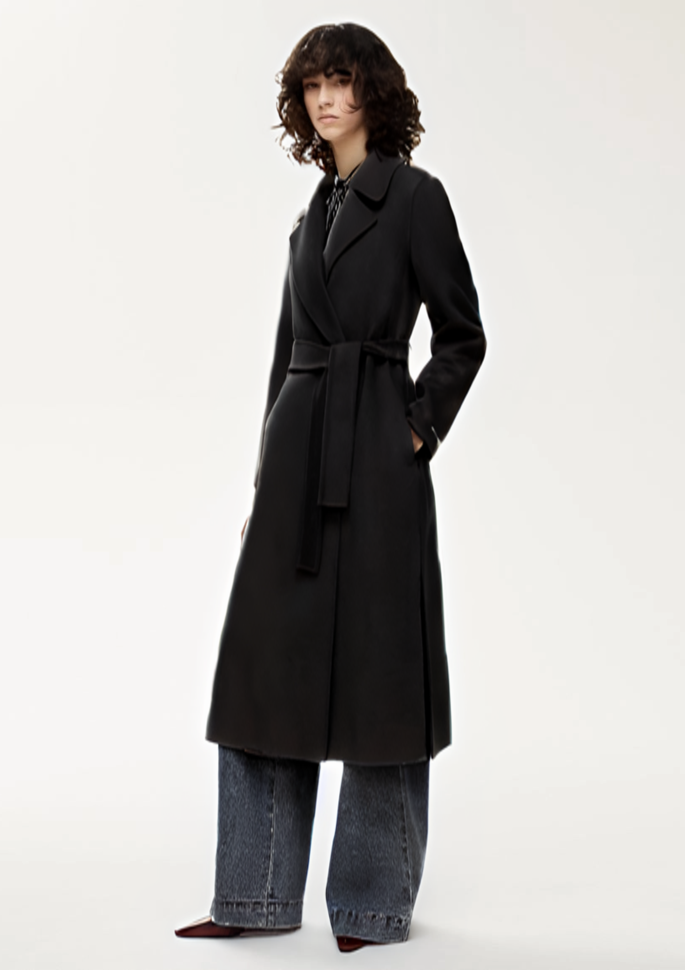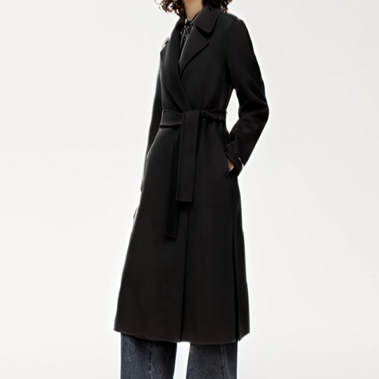 Designed in a relaxed robe cut, it features a structured lapel collar, long sleeves, and a double-breasted front secured with a matching belt for added definition. In-seam side pockets and subtle side slits offer both functionality and fluid movement, while the regular fit ensures all-day comfort without sacrificing style.
