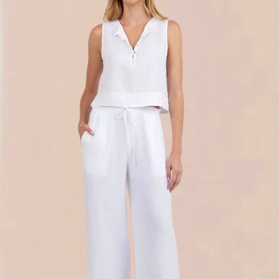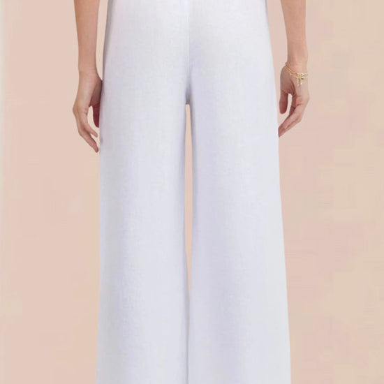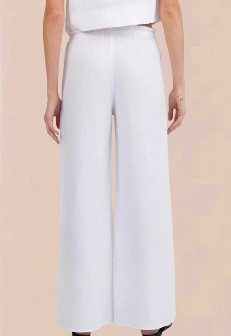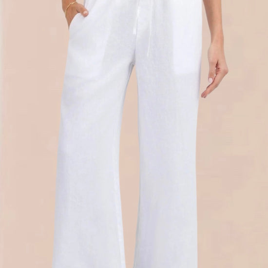 Ruffle Wide Leg Trousers in breathable 100% linen offer effortless summer elegance with relaxed, sophisticated style. Featuring an elasticated waist, drawstring, and convenient side pockets, these versatile trousers from Bella Dahl deliver all-day comfort for warm weather adventures. The neutral white tone seamlessly complements any wardrobe, making them an essential piece for holiday getaways, casual weekends, and transitional seasons. Lightweight and easy to style, they're perfect for creating relaxed looks without compromise. Ideal for those seeking quality linen trousers that combine comfort with timeless appeal.