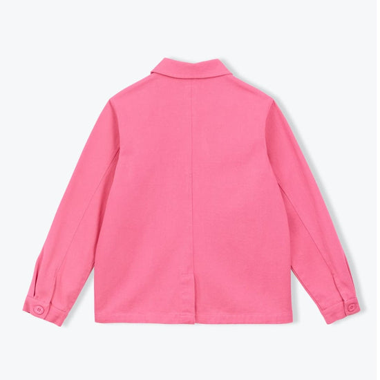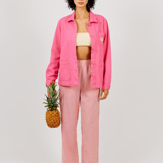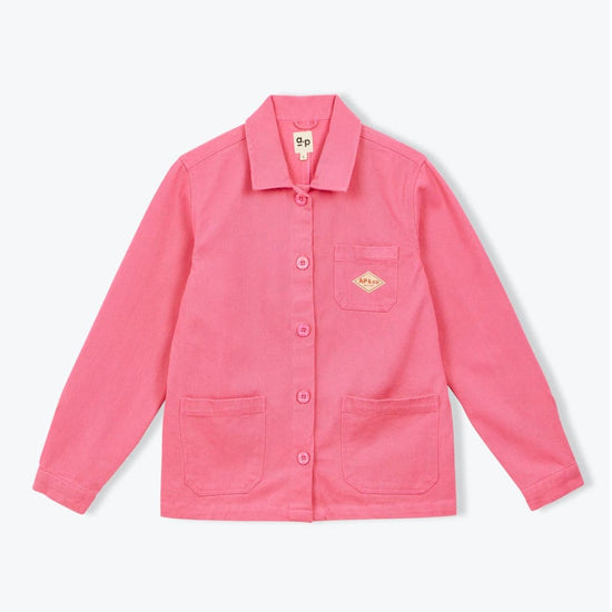 Rustic Cotton Jacket from Arsene Et Les Pipelettes. This women's drill jacket features a classic shirt collar, tone-on-tone button fastening, and long sleeves with finished cuffs. Two front patch pockets and a chest patch pocket branded with "AP & CO" detailing add practical style. Effortlessly versatile—layer over summer dresses, pair with daily denim, or throw over shorts for easy casual wear that transitions seamlessly through your wardrobe.